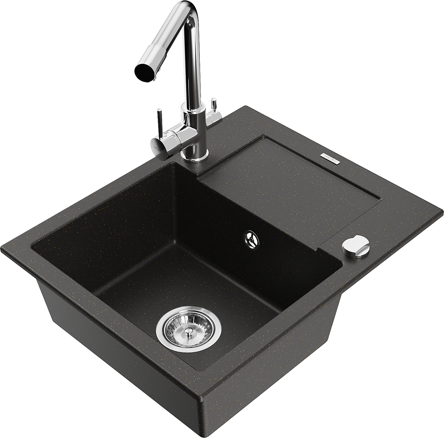 Mexen Enzo évier en granit 1 bac avec égouttoir et mitigeur de cuisine Duero, noir/doré métallisé - 6506-75-671600-00