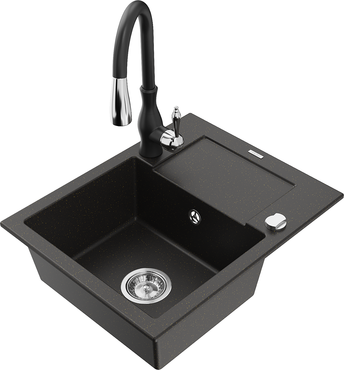 Mexen Enzo évier de cuisine en granit 1 bac avec égouttoir et robinet de cuisine Savita, noir/or métallique - 6506-75-672601-70