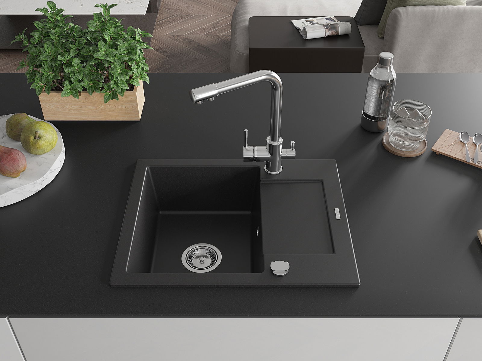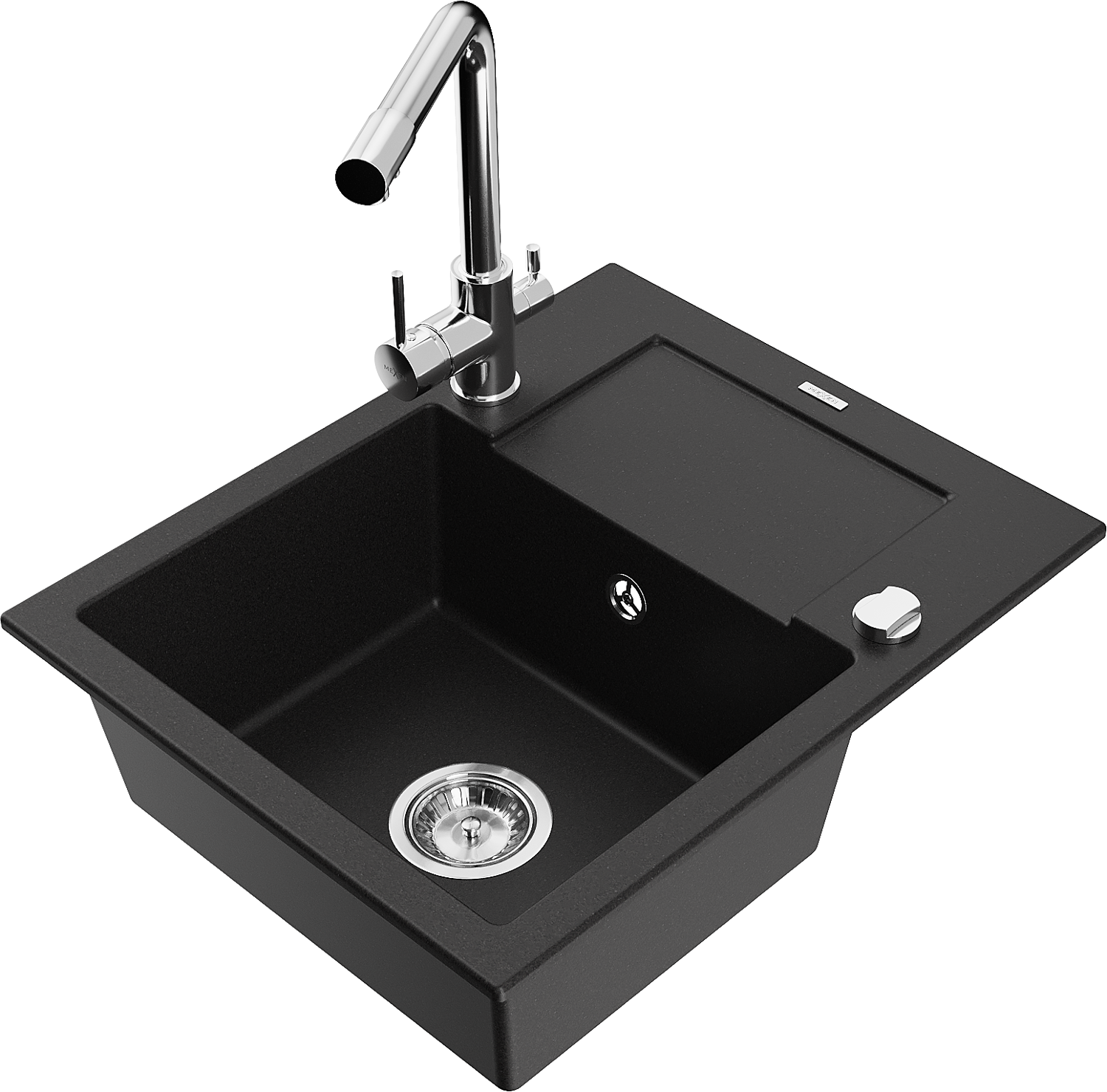 Mexen Enzo évier en granit 1-cuve avec égouttoir et robinet de cuisine Duero, noir - 6506-77-671600-00