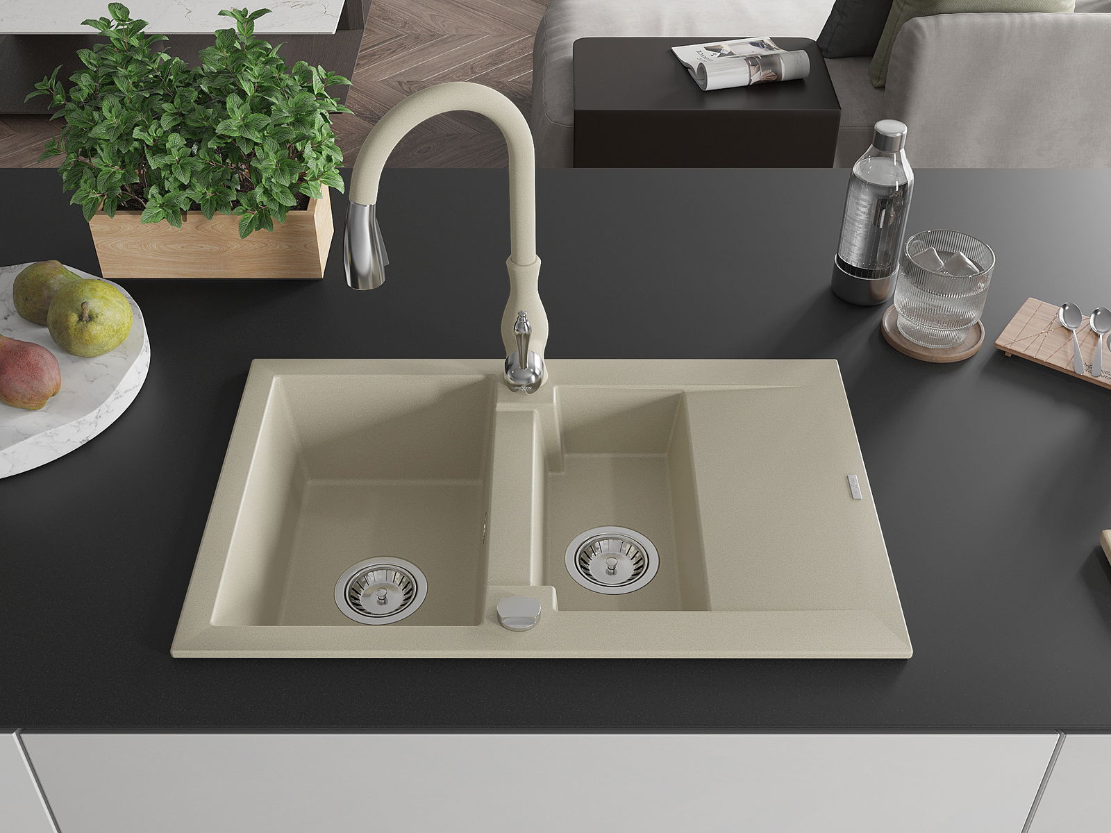 Mexen Gaspar évier en granit 1,5 bac avec égouttoir et robinet de cuisine Savita, beige - 6507-69-672601-69