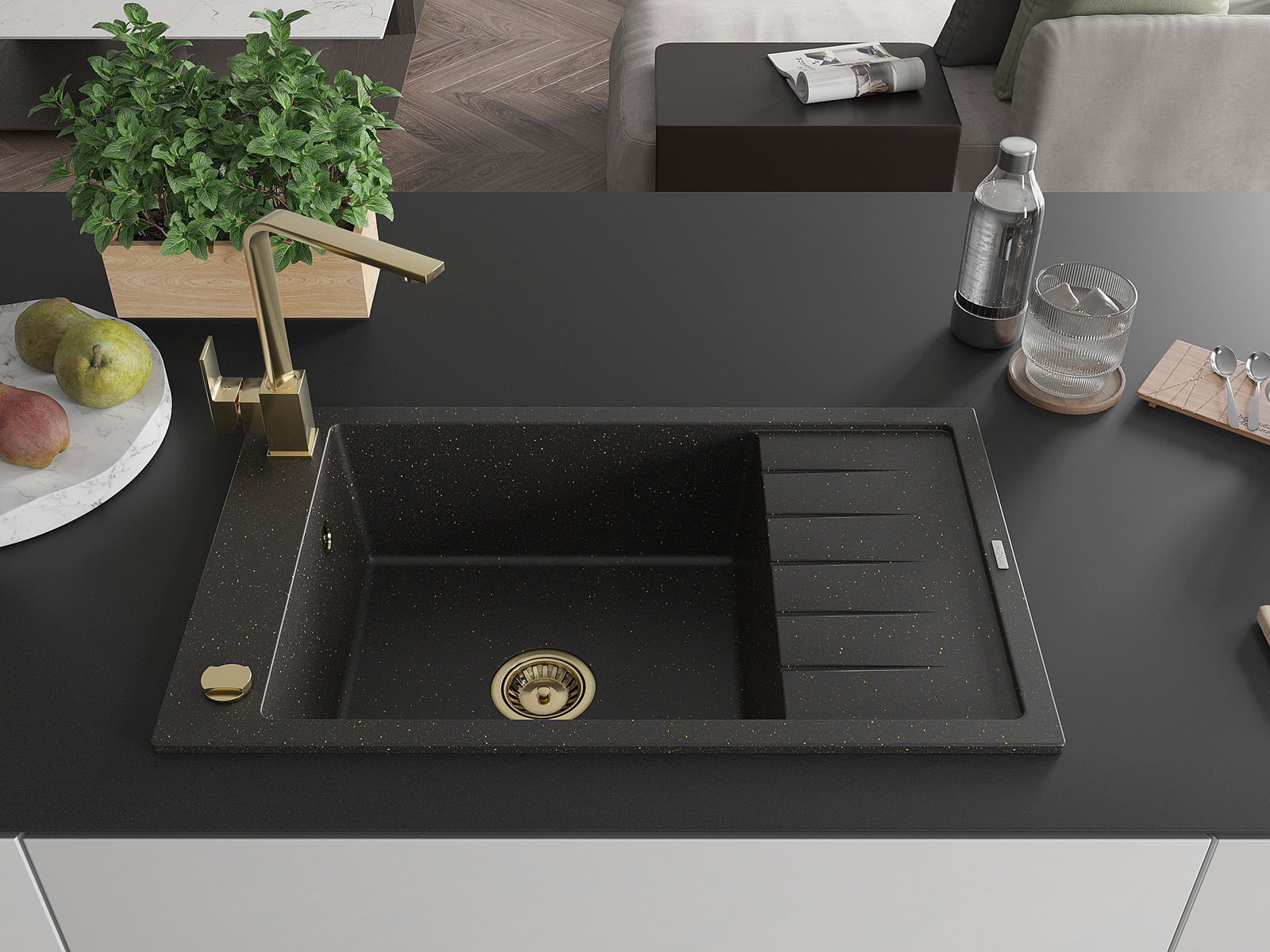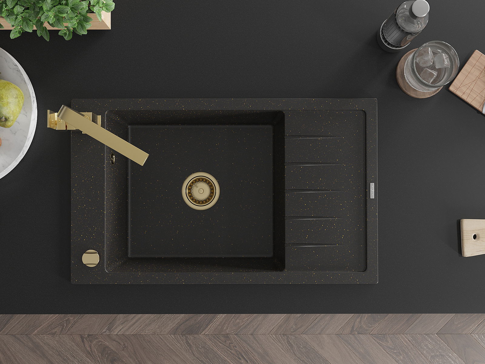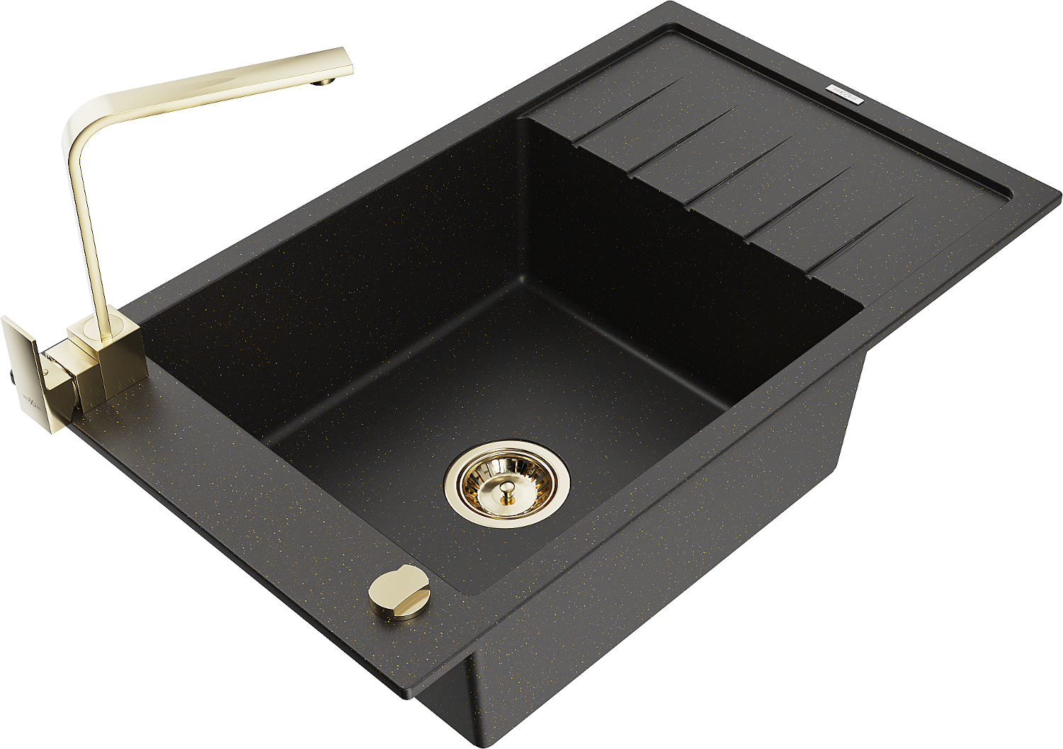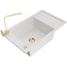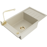 Mexen Elias évier en granit 1 bac avec égouttoir et robinet de cuisine Rita, noir/or métallisé - 6511-75-670300-50