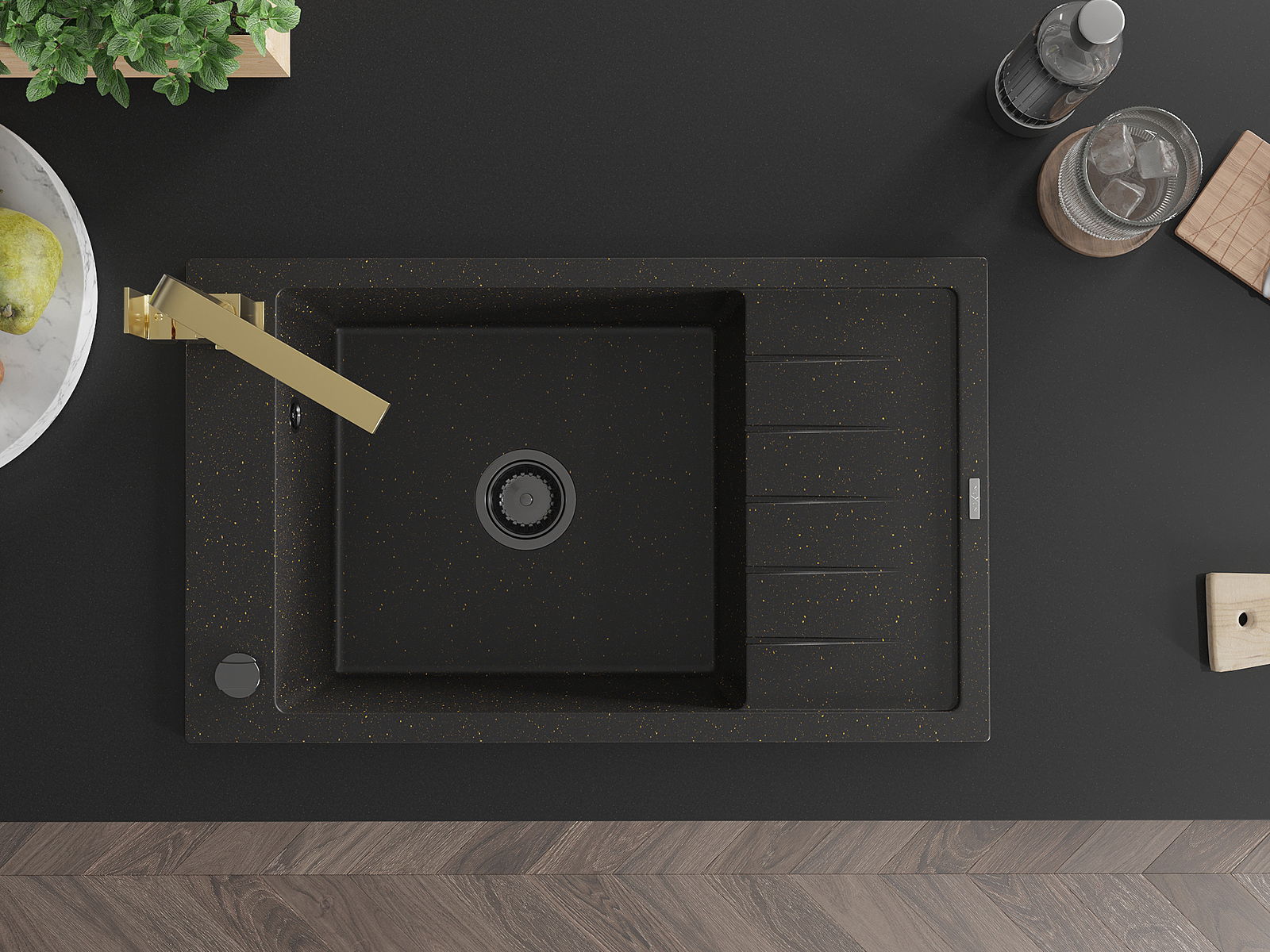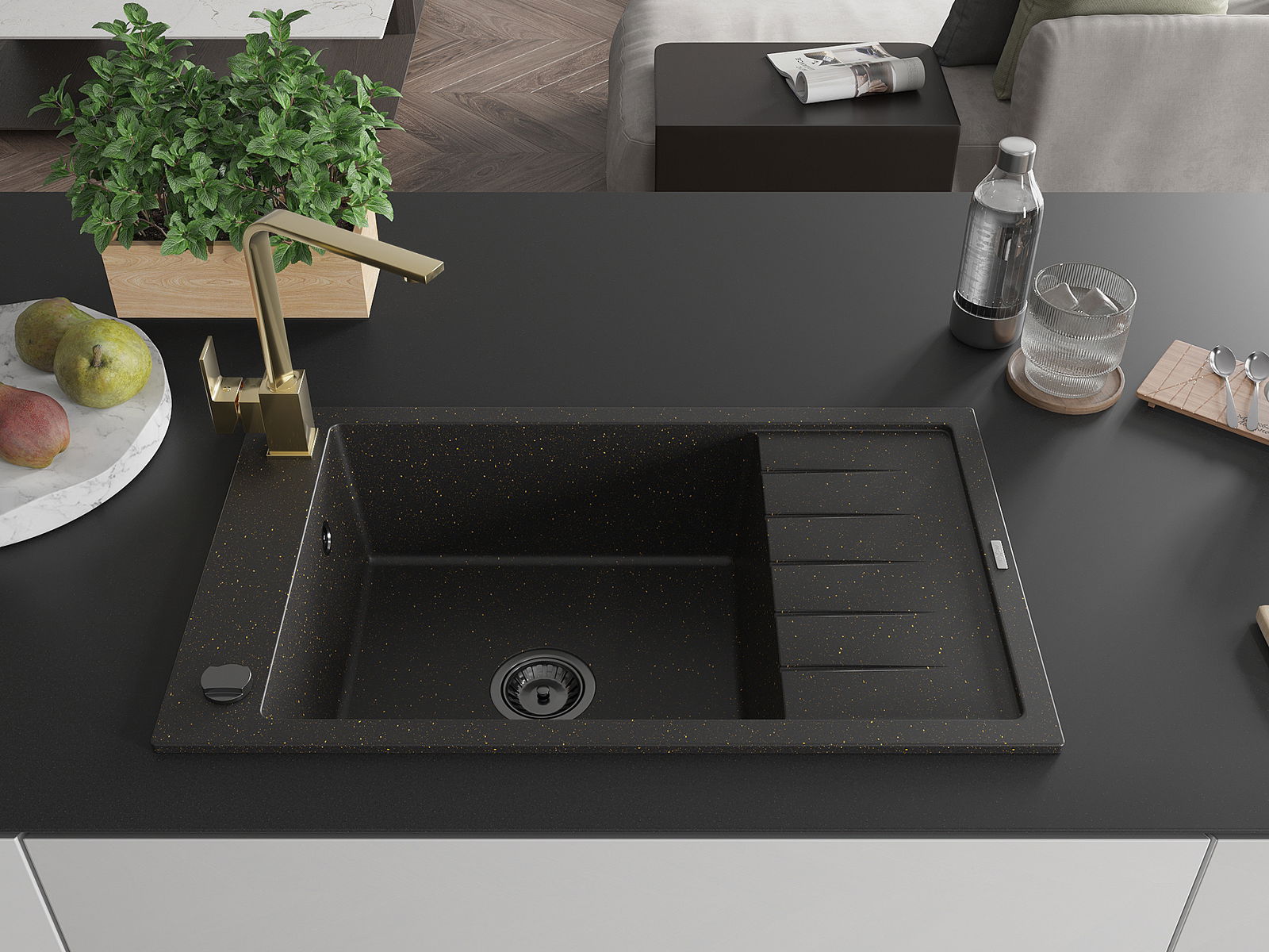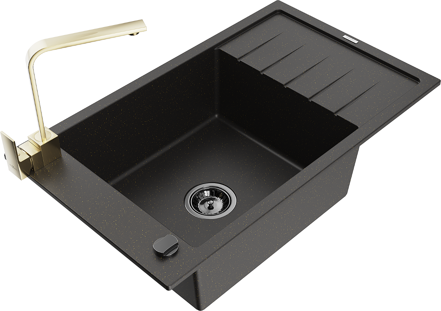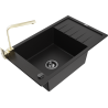 Mexen Elias évier en granit 1 bac avec égouttoir et mitigeur de cuisine Rita, noir/or métallisé - 6511-75-670300-50-B