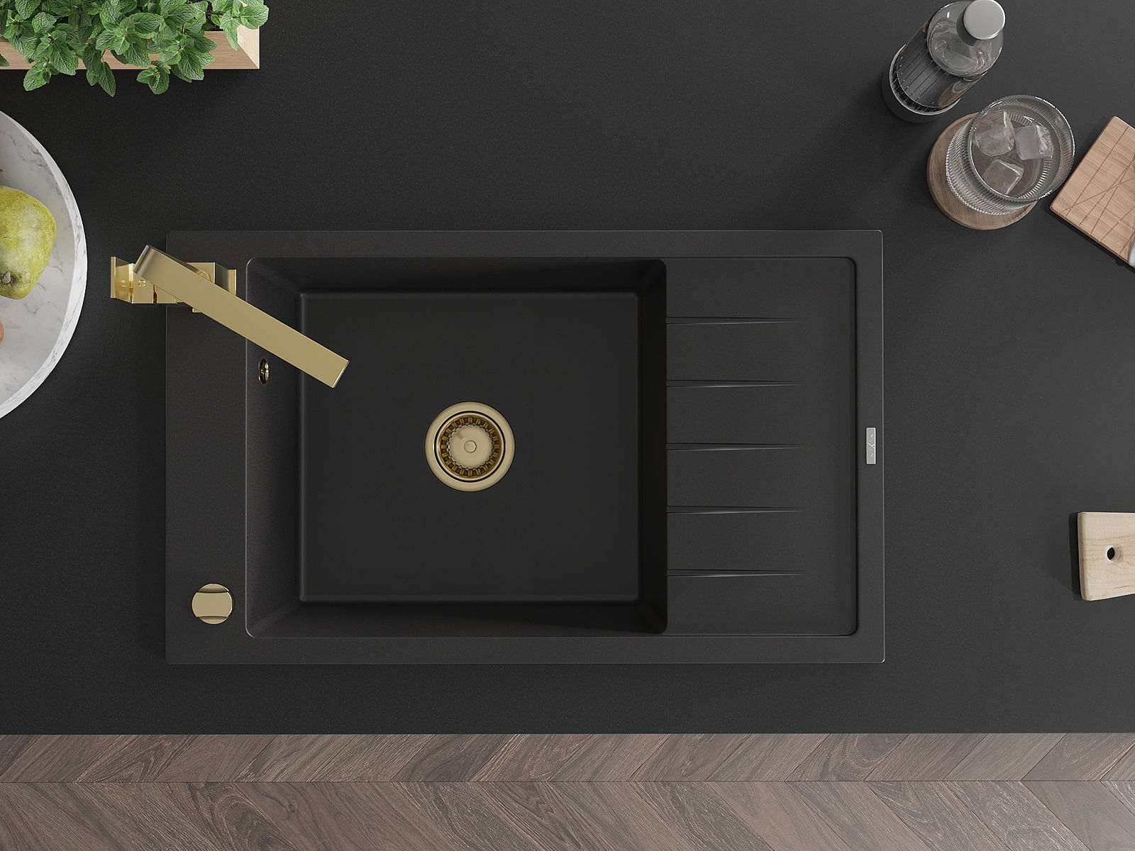 L'évier a un trou sous-meulé de 35 mm de diamètre à percer soi-même. Il peut être utilisé, entre autres, pour installer un distributeur de liquide, ce qui éliminera la présence de bouteilles en plastique dans la cuisine et lui donnera une finition élégante.