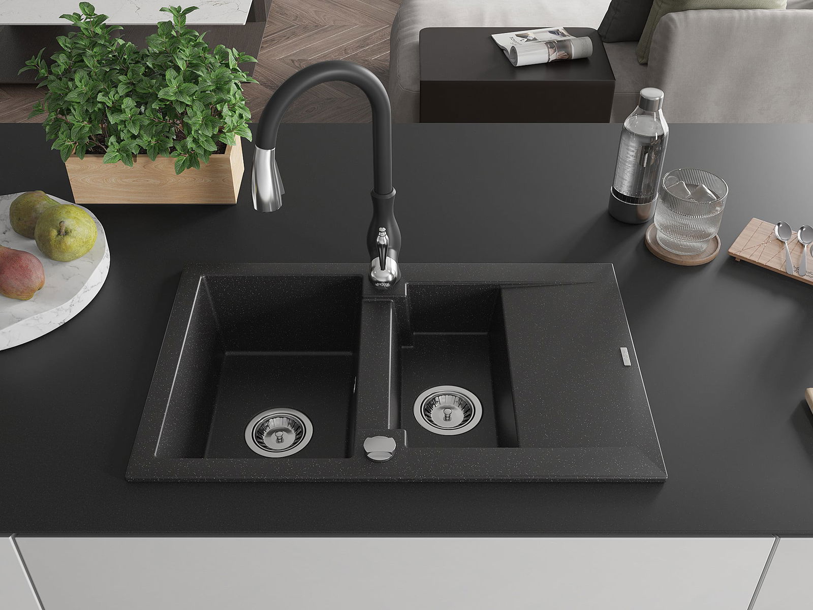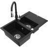 Mexen Gaspar évier de cuisine en granit 1,5 bac avec égouttoir et robinet de cuisine Savita, noir/argent - 6507-73-672601-70
