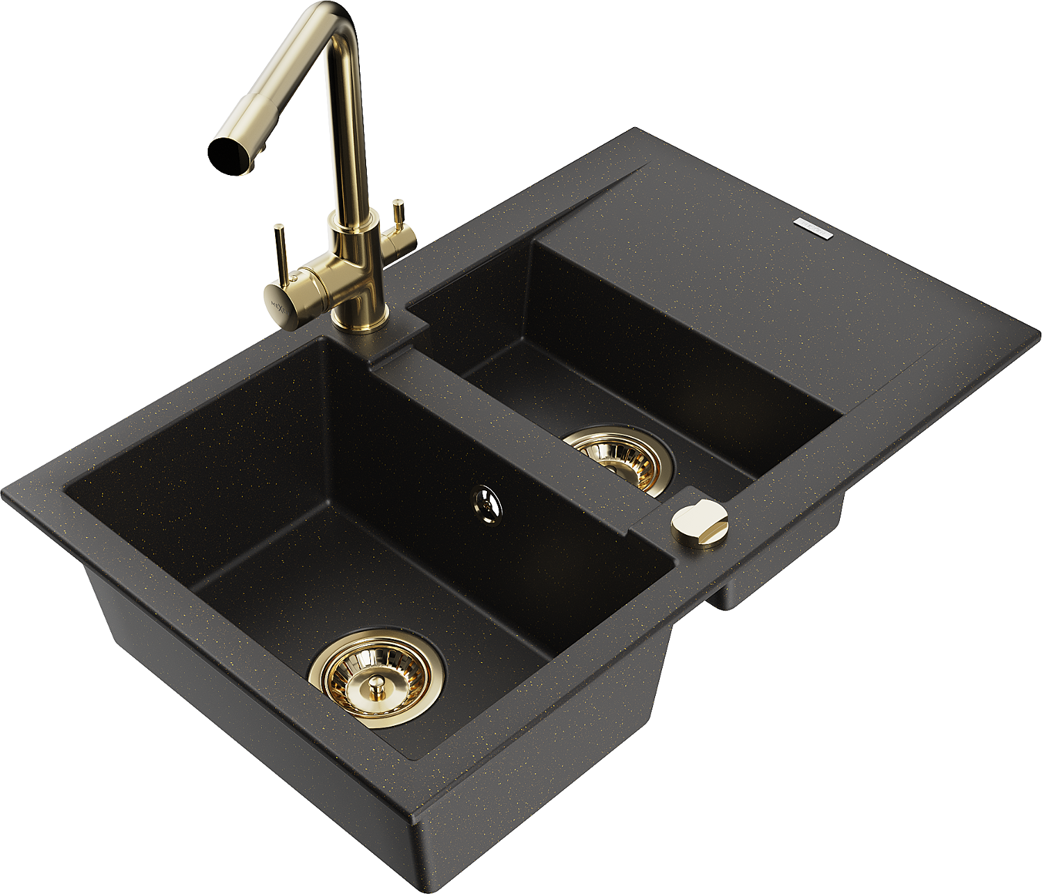 Mexen Gaspar évier en granit 1,5 bac avec égouttoir et robinet de cuisine Duero, noir/or métallisé - 6507-75-671600-50