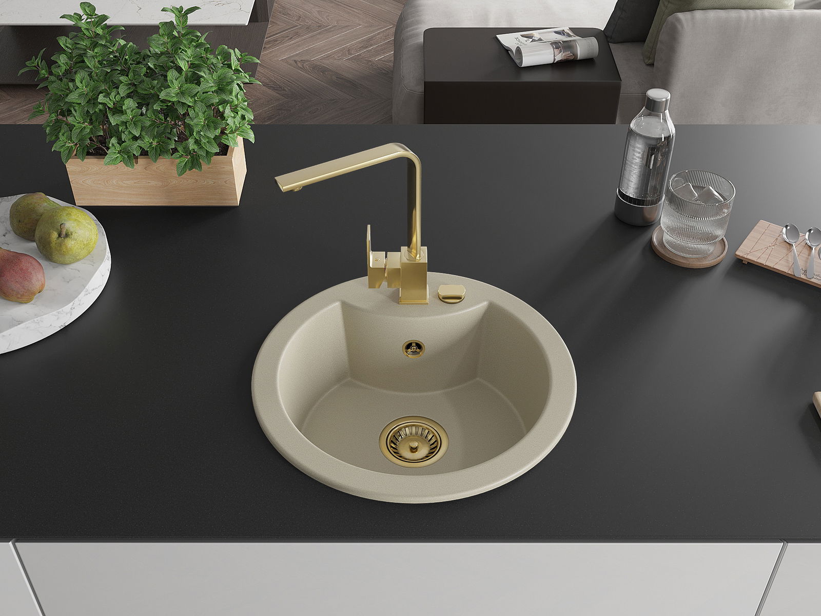 L'évier a un trou sous-meulé de 35 mm de diamètre à percer soi-même. Il peut être utilisé, entre autres, pour installer un distributeur de liquide, ce qui éliminera la présence de bouteilles en plastique dans la cuisine et lui donnera une finition élégante.