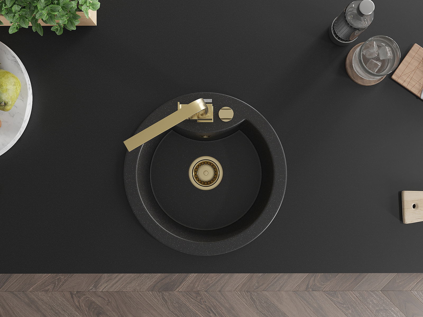 L'évier a un trou sous-meulé de 35 mm de diamètre à percer soi-même. Il peut être utilisé, entre autres, pour installer un distributeur de liquide, ce qui éliminera la présence de bouteilles en plastique dans la cuisine et lui donnera une finition élégante.