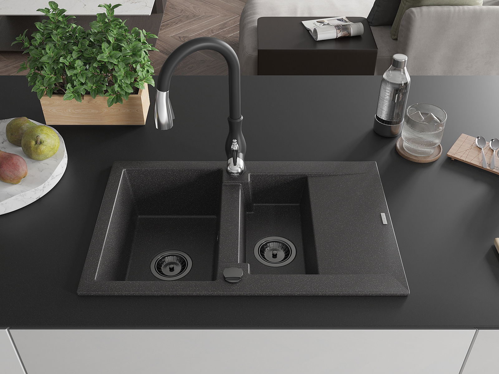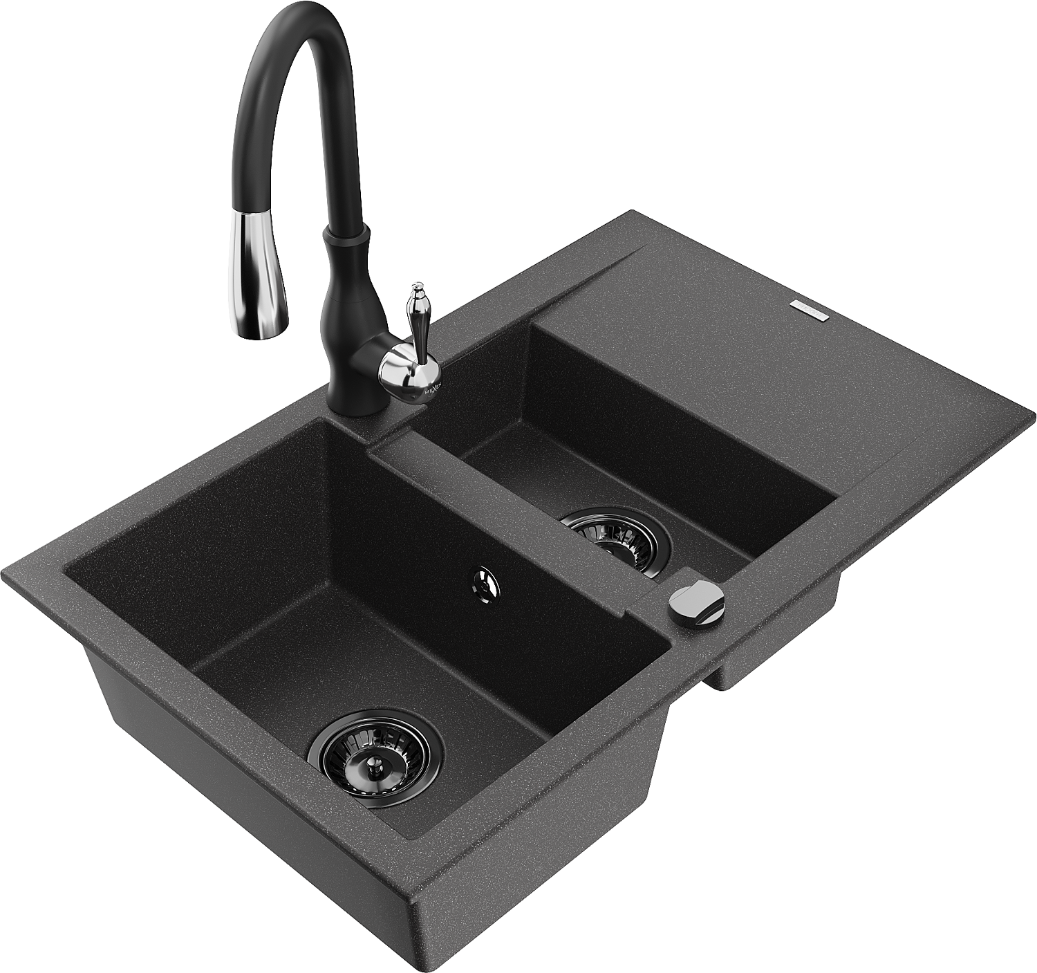 Mexen Gaspar évier de cuisine en granit 1,5 bac avec égouttoir et robinet Savita, noir moucheté - 6507-76-672601-70-B