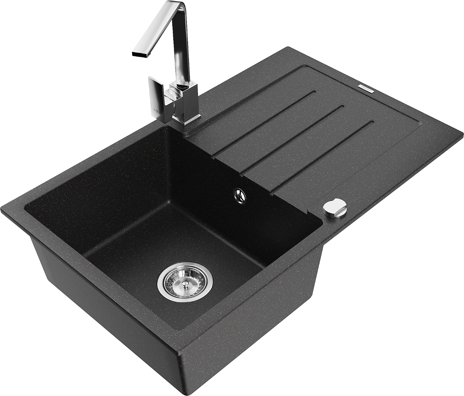 Mexen Bruno évier en granit 1 bac avec égouttoir et mitigeur cuisine Rita, noir/argenté métallisé - 6513-73-670300-00