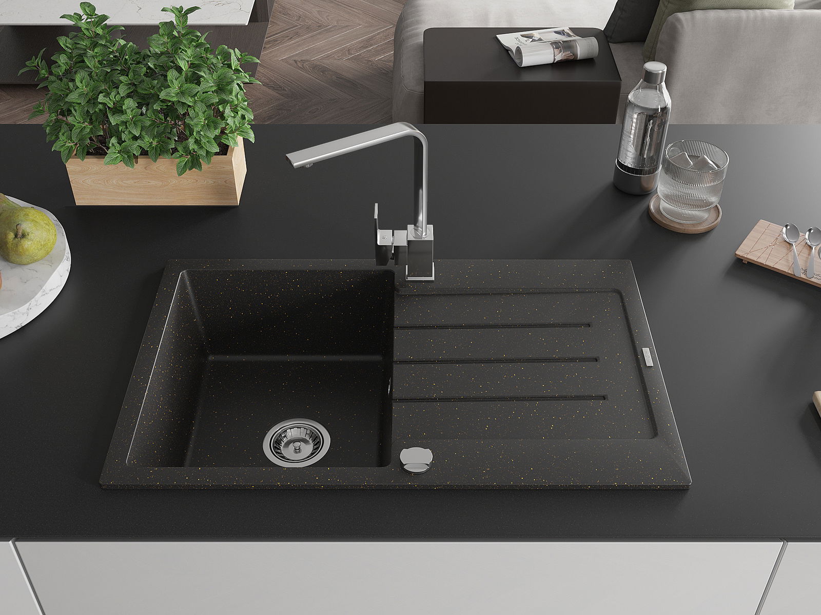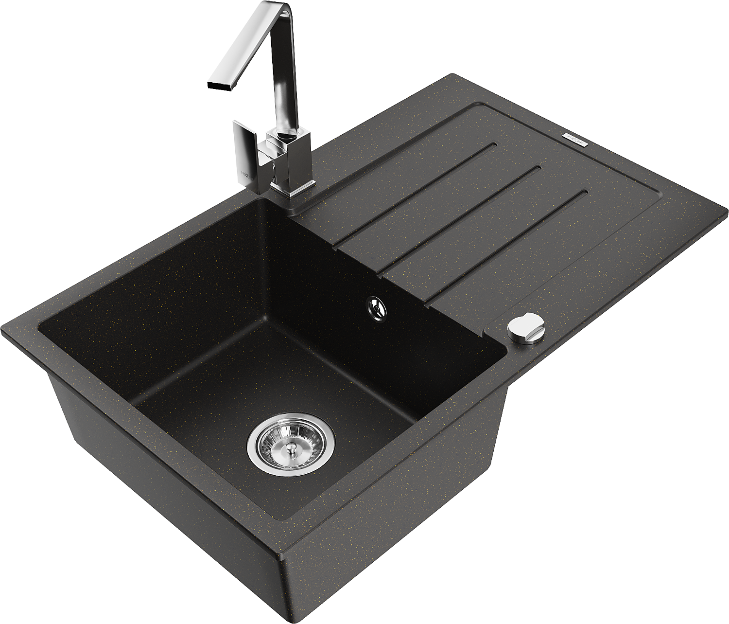Mexen Bruno évier en granit 1 bac avec égouttoir et robinet de cuisine Rita, noir/or métallique - 6513-75-670300-00