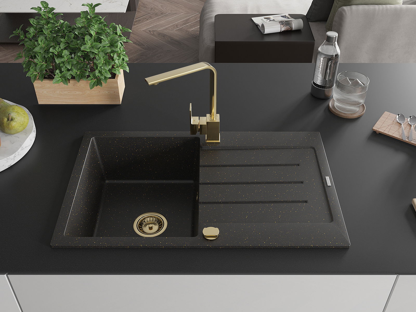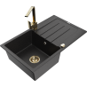 Mexen Bruno évier en granit 1 bac avec égouttoir et robinet de cuisine Rita, noir/métallique or - 6513-75-670300-50