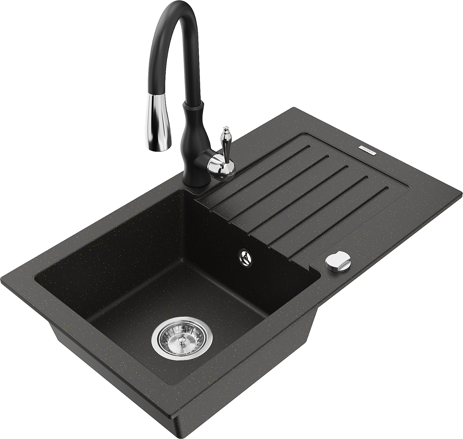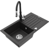 Mexen Pablo évier en granit 1 bac avec égouttoir et robinet de cuisine Savita, noir/doré métallique - 6510-75-672601-70
