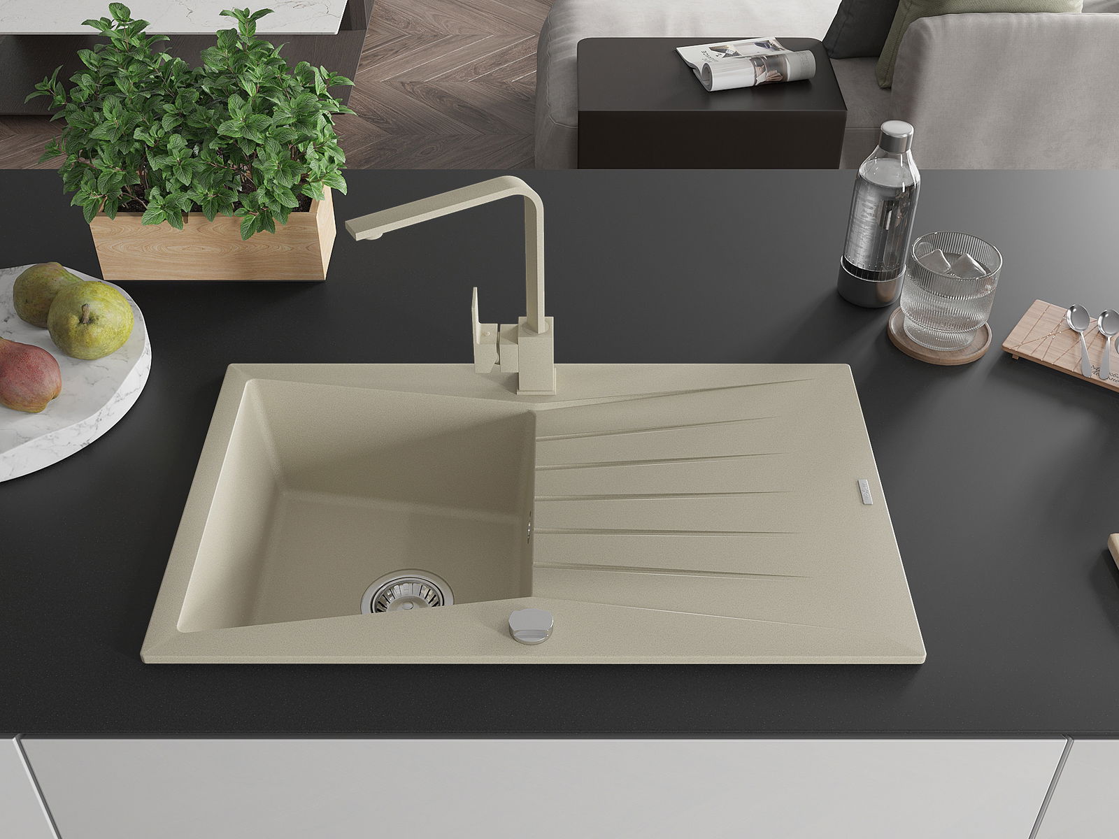 Mexen Cesar évier de cuisine en granit 1-bassin avec égouttoir et robinet de cuisine Rita, beige - 6514-69-670300-69