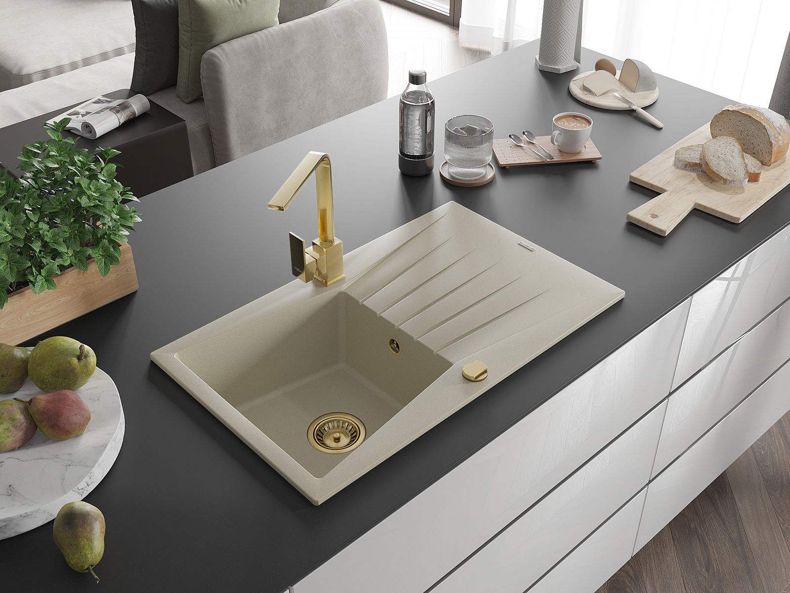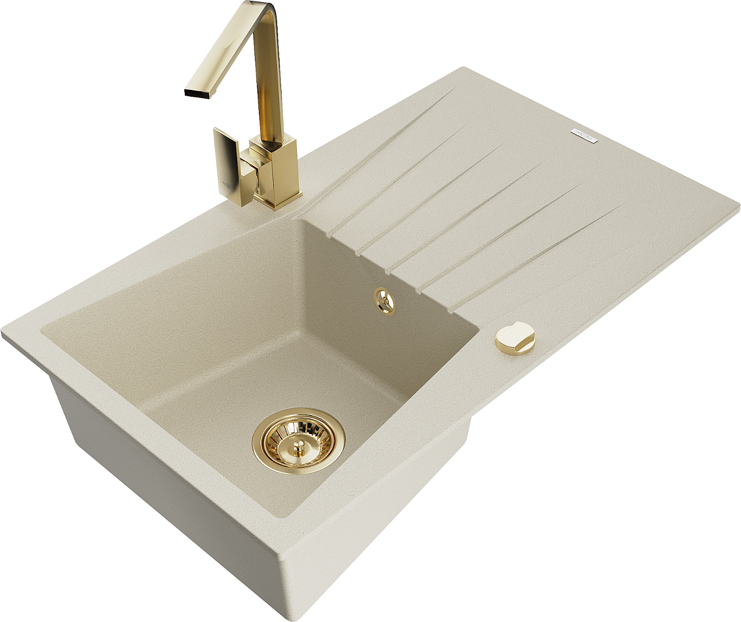 Mexen Cesar évier en granit 1 bac avec égouttoir et robinet de cuisine Rita, beige - 6514-69-670300-50