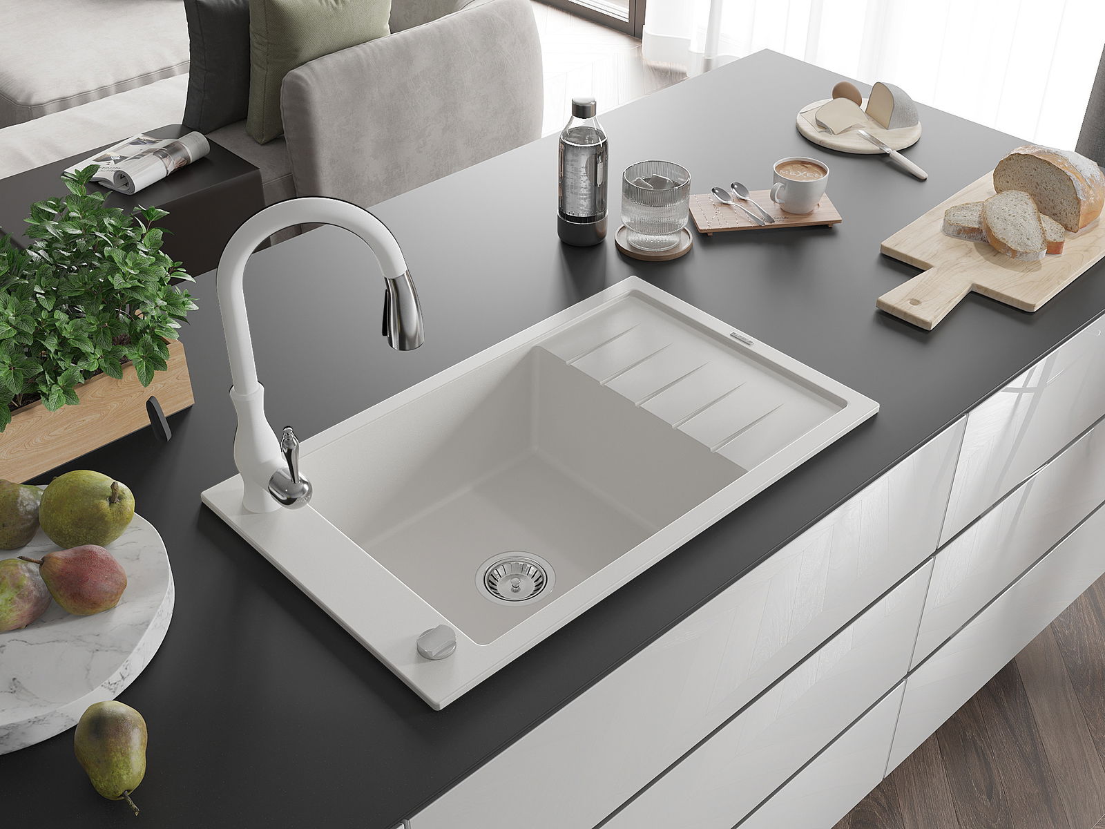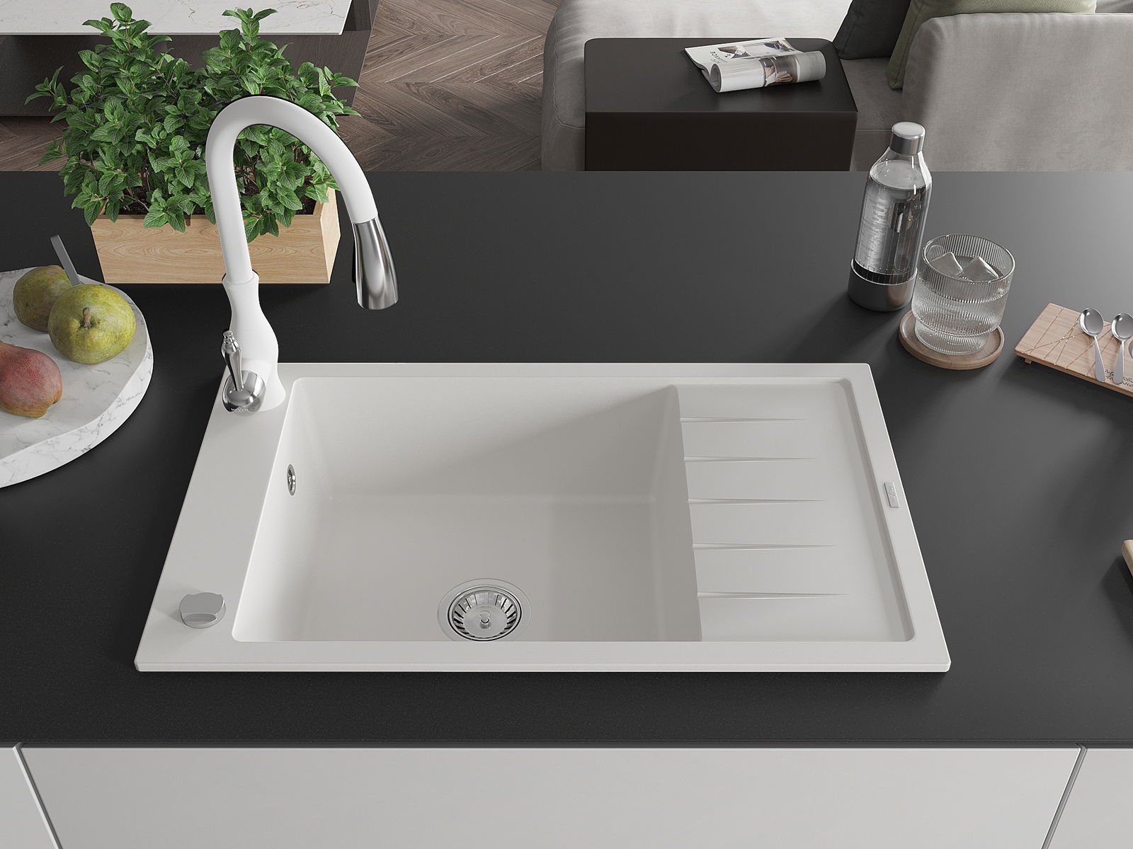 La surface de l'évier est résistante aux taches et aux décolorations, ce qui la rend facile à nettoyer et permet à sa couleur de rester intacte pendant longtemps. Un complément esthétique et pratique pour chaque cuisine.