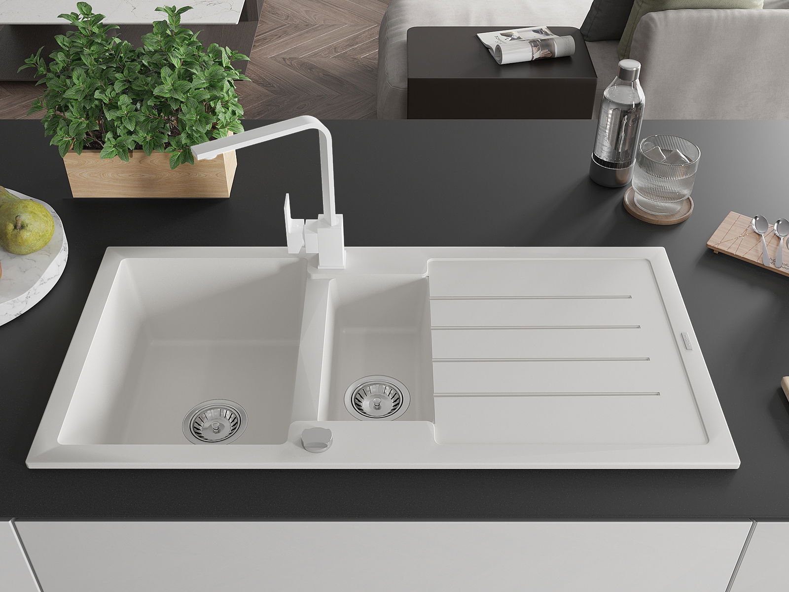 Mexen Andres évier en granit 1,5 bac avec égouttoir et robinet de cuisine Rita, blanc - 6515-20-670300-20