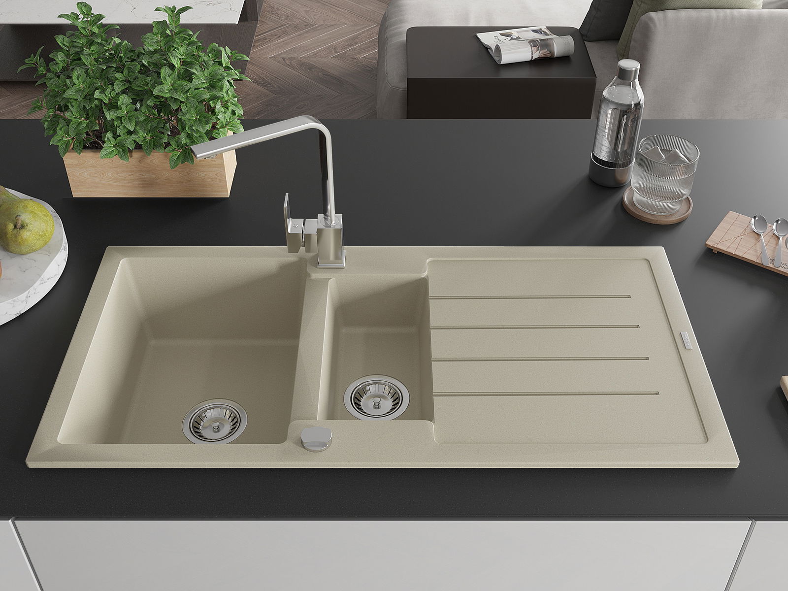 Mexen Andres évier en granit 1,5 bac avec égouttoir et robinet de cuisine Rita, beige - 6515-69-670300-00