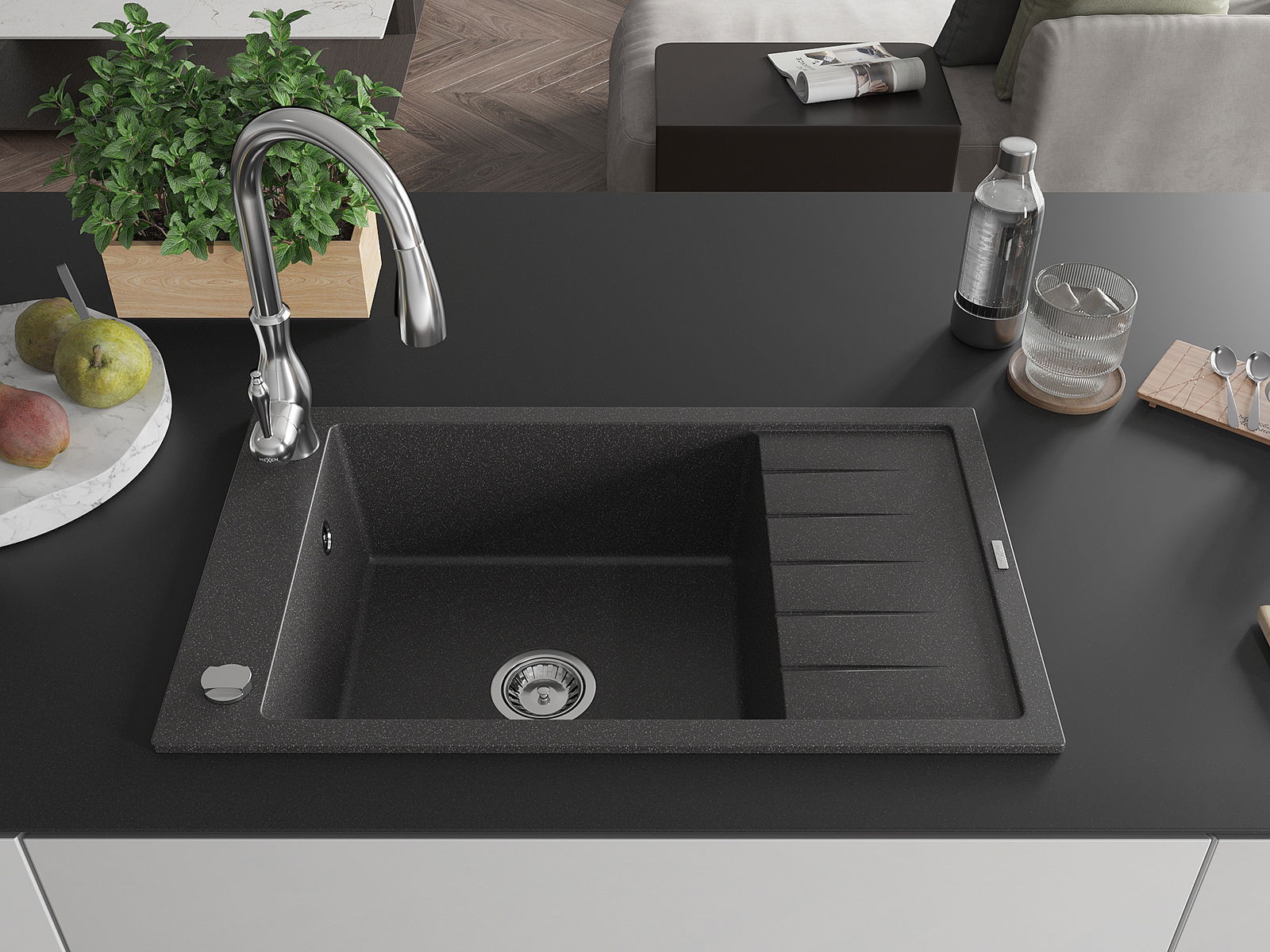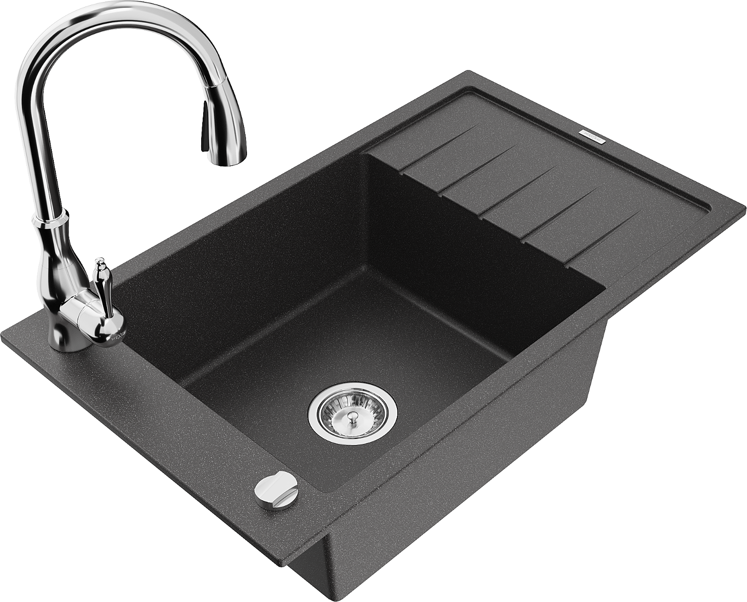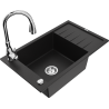 Mexen Elias évier en granit 1 bac avec égouttoir et robinet de cuisine Savita, noir moucheté - 6511-76-672601-00