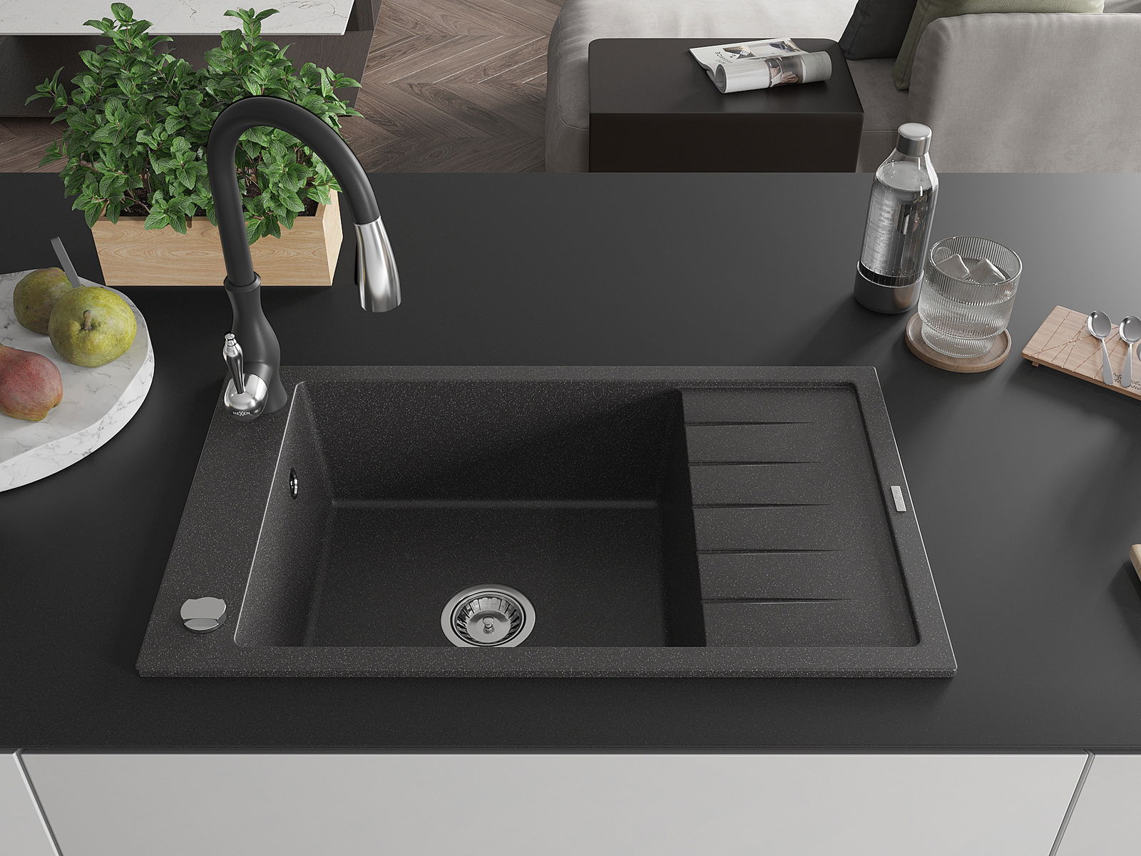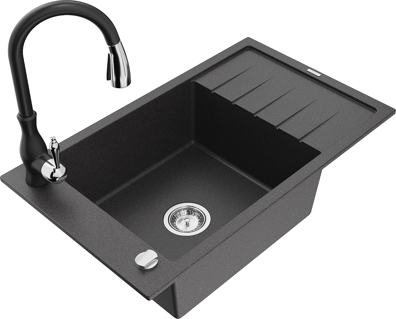 Mexen Elias évier en granit 1 bac avec égouttoir et robinet de cuisine Savita, noir moucheté - 6511-76-672601-70