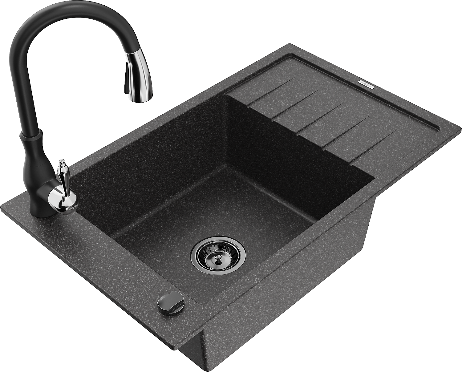 Mexen Elias évier en granit 1 bac avec égouttoir et robinet de cuisine Savita, noir moucheté - 6511-76-672601-70-B