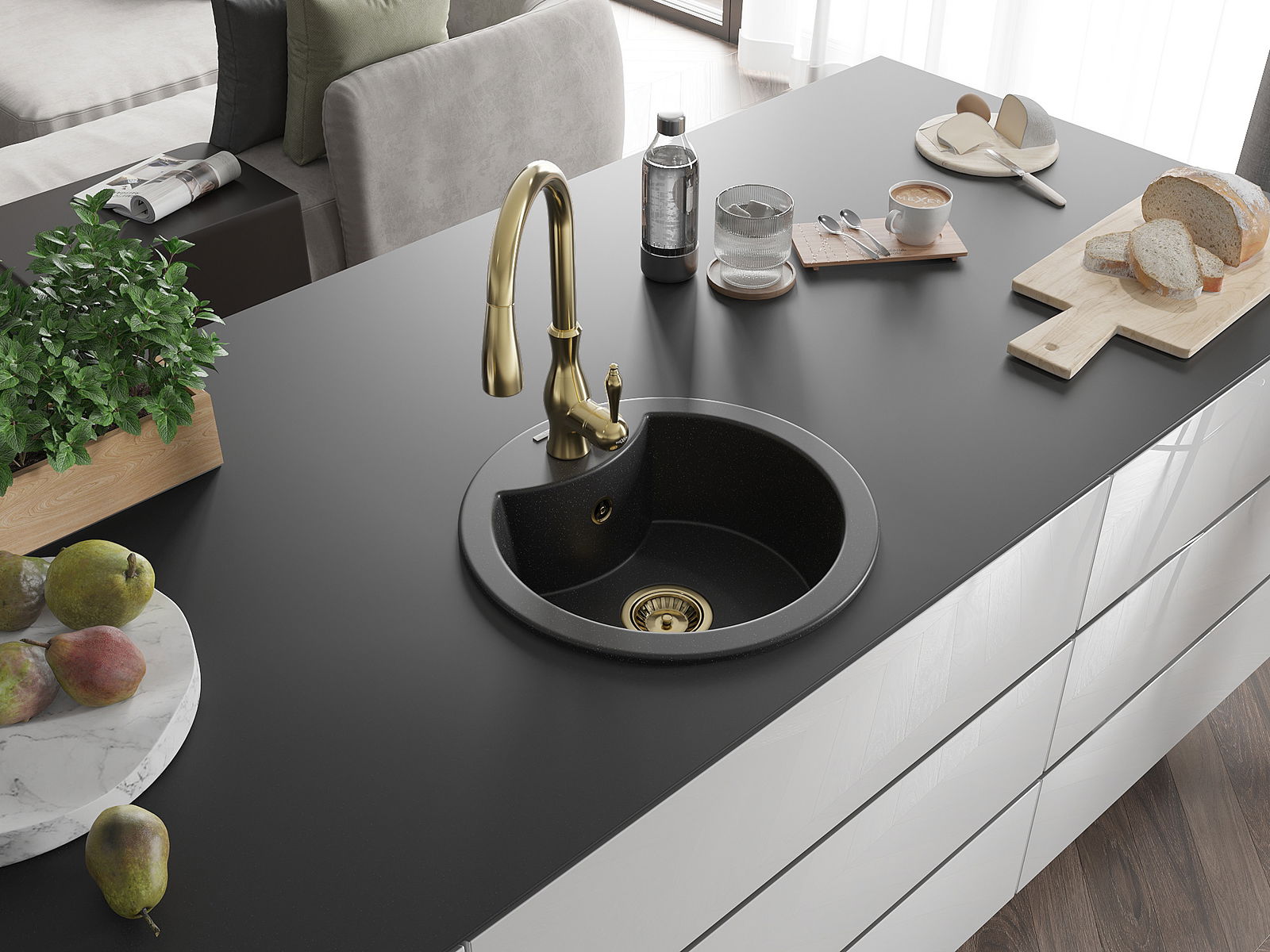 L'évier a un trou sous-meulé de 35 mm de diamètre à percer soi-même. Il peut être utilisé, entre autres, pour installer un distributeur de liquide, ce qui éliminera la présence de bouteilles en plastique dans la cuisine et lui donnera une finition élégante.