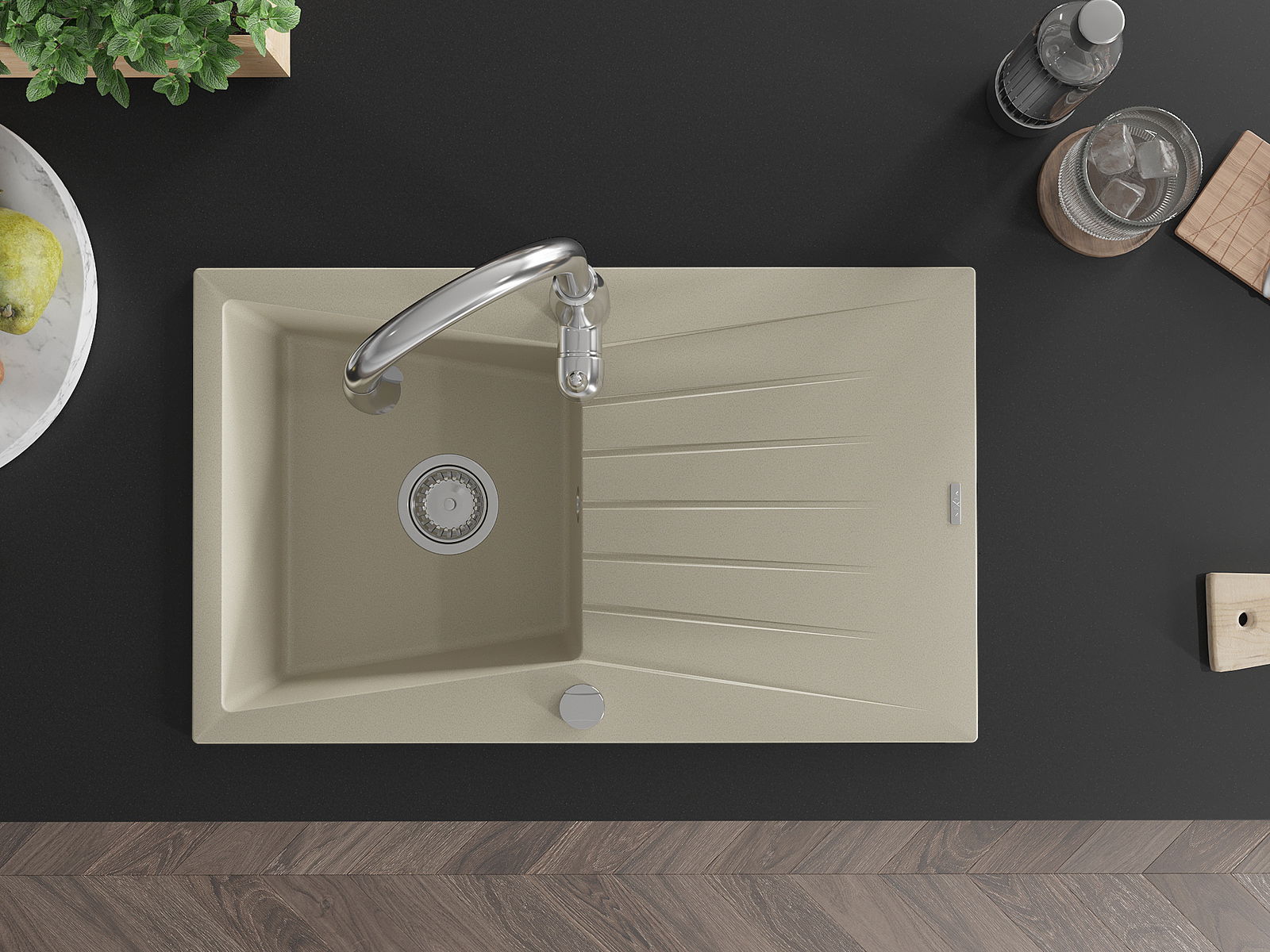Mexen Cesar évier en granit 1 bac avec égouttoir et robinet de cuisine Savita, beige - 6514-69-672601-00
