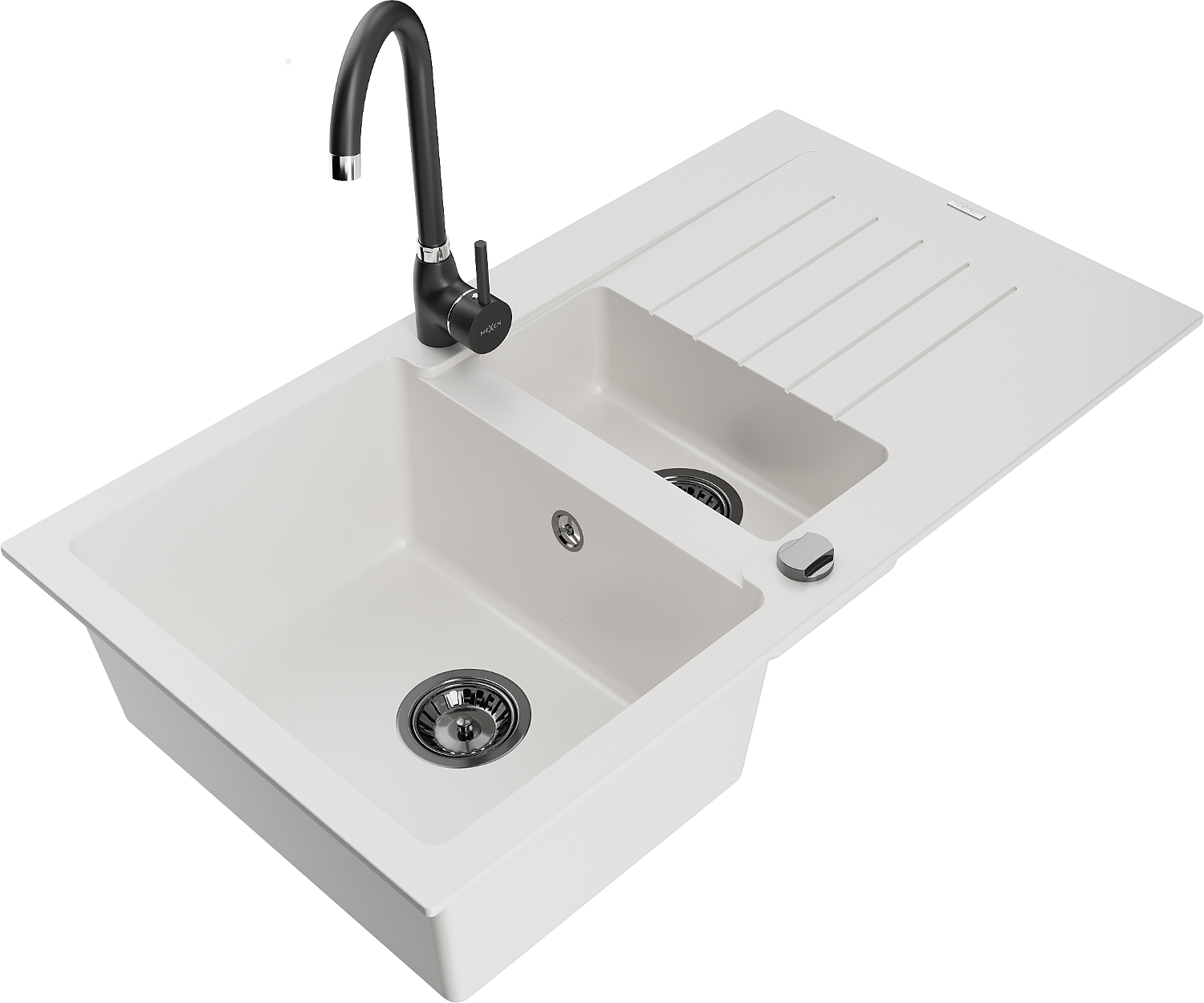 Mexen Matias évier en granit 1,5 bacs avec égouttoir et robinet de cuisine Telma, blanc - 6502-20-670200-70