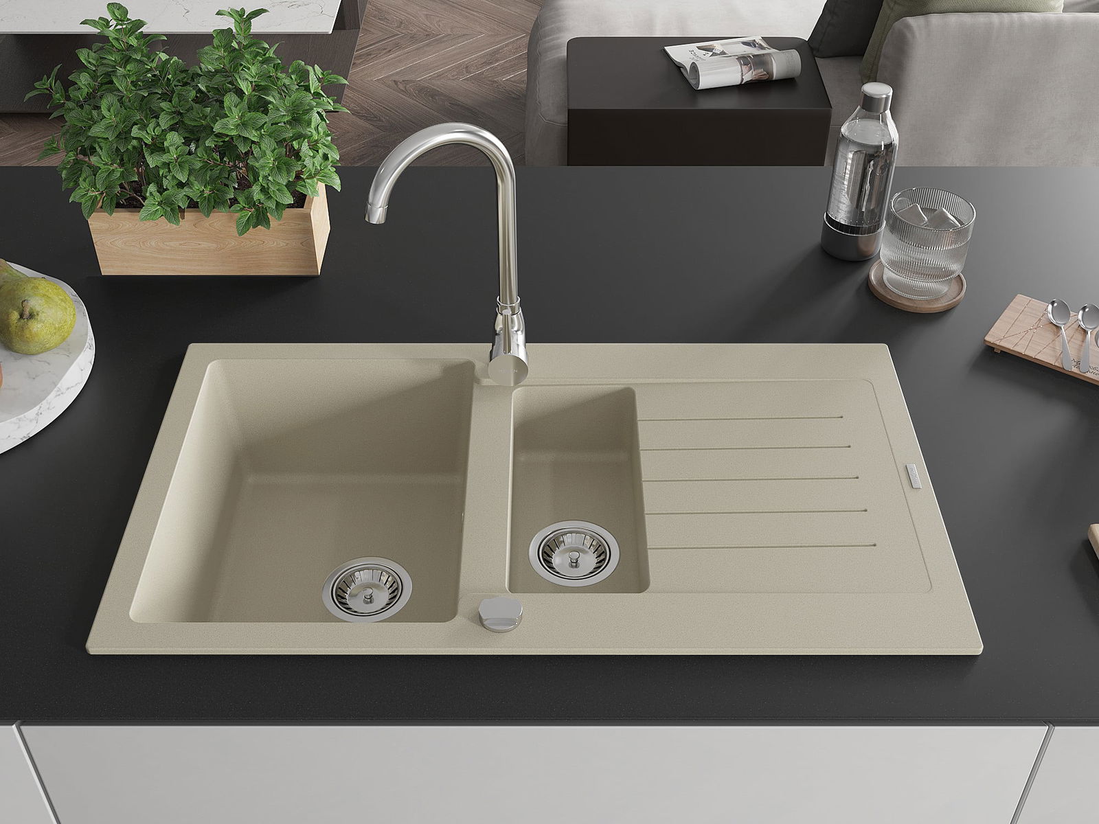 Mexen Matias évier en granit 1,5 cuve avec égouttoir et robinet de cuisine Telma, beige - 6502-69-670200-00