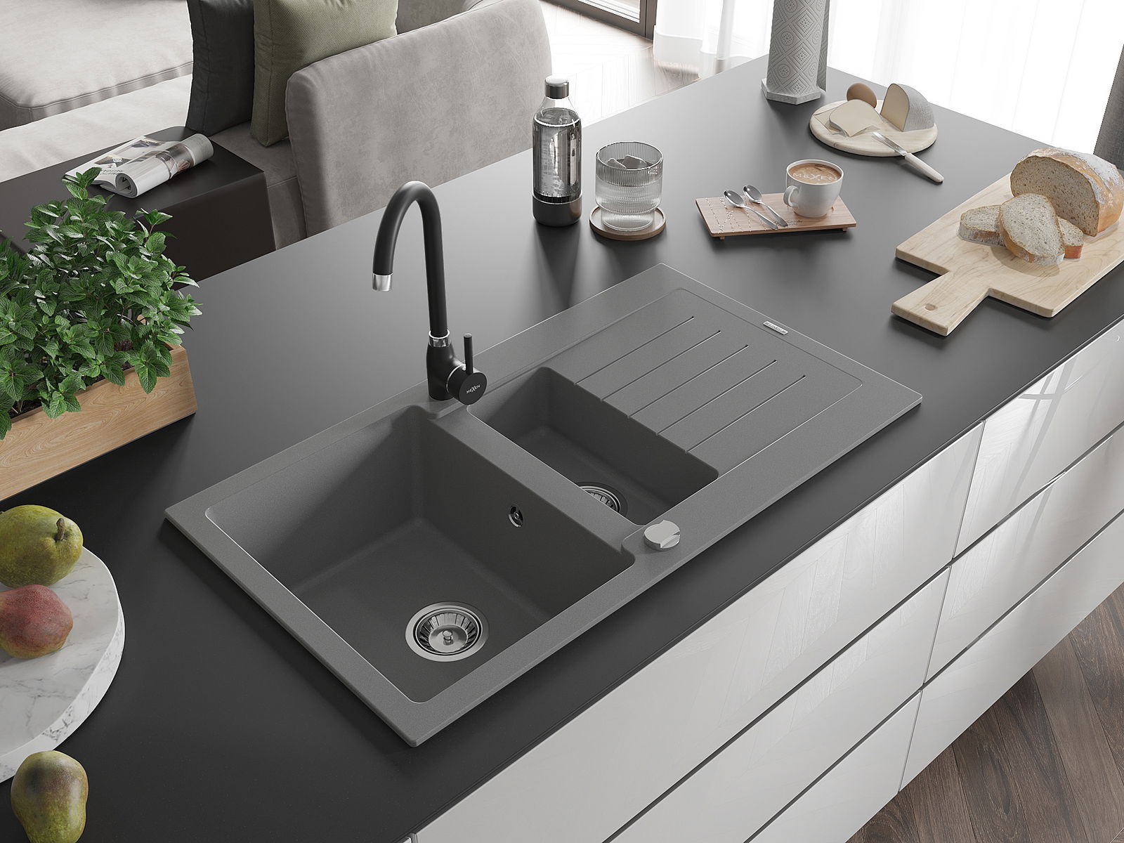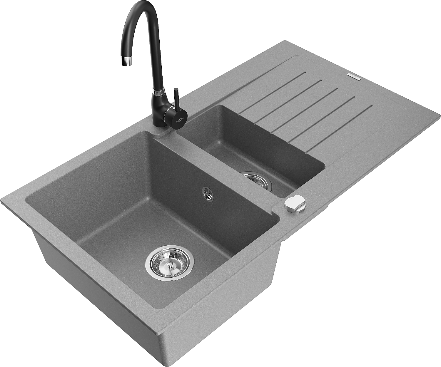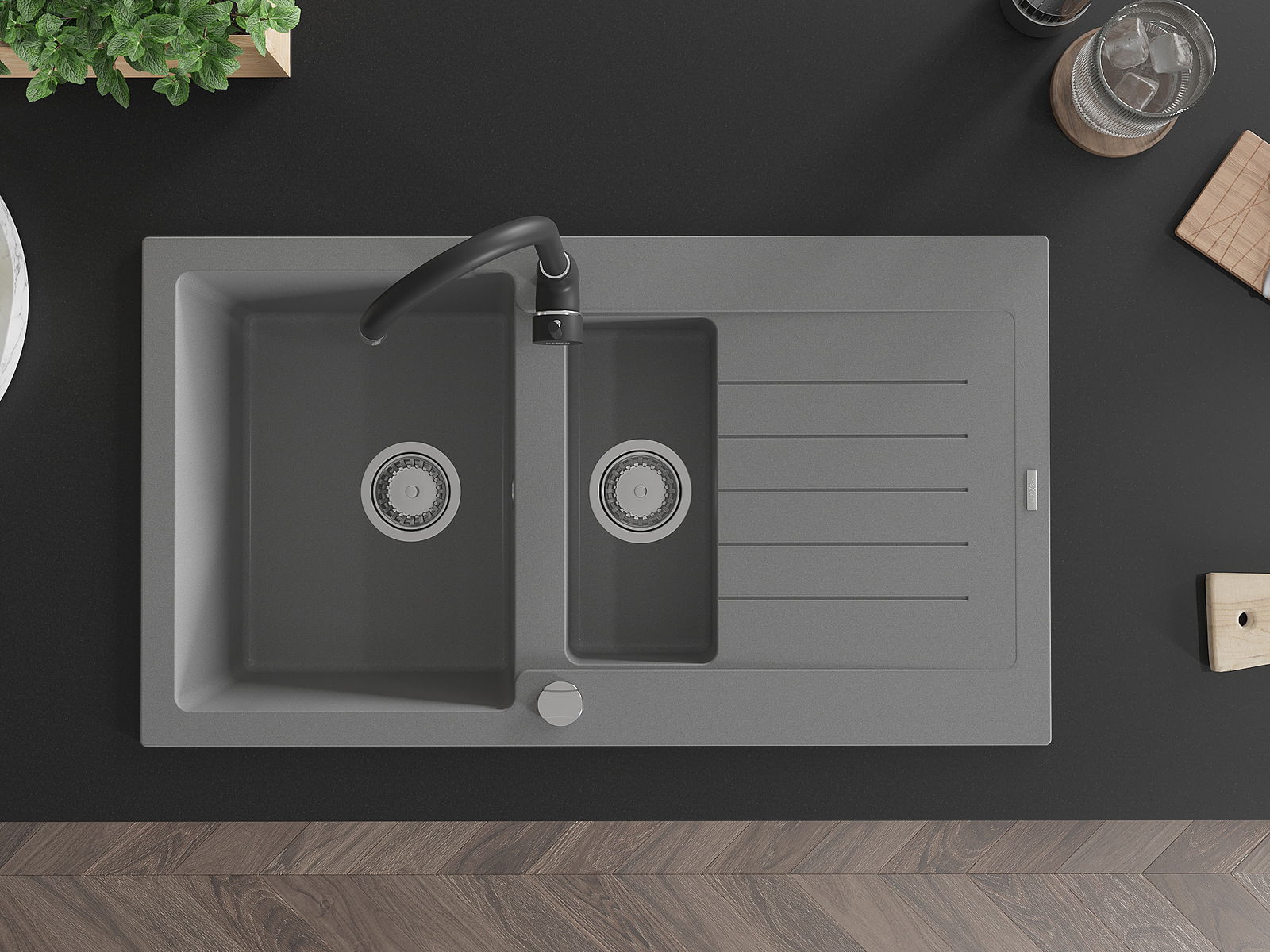 Mexen Matias évier en granit 1,5 bac avec égouttoir et robinet de cuisine Telma, gris - 6502-71-670200-70