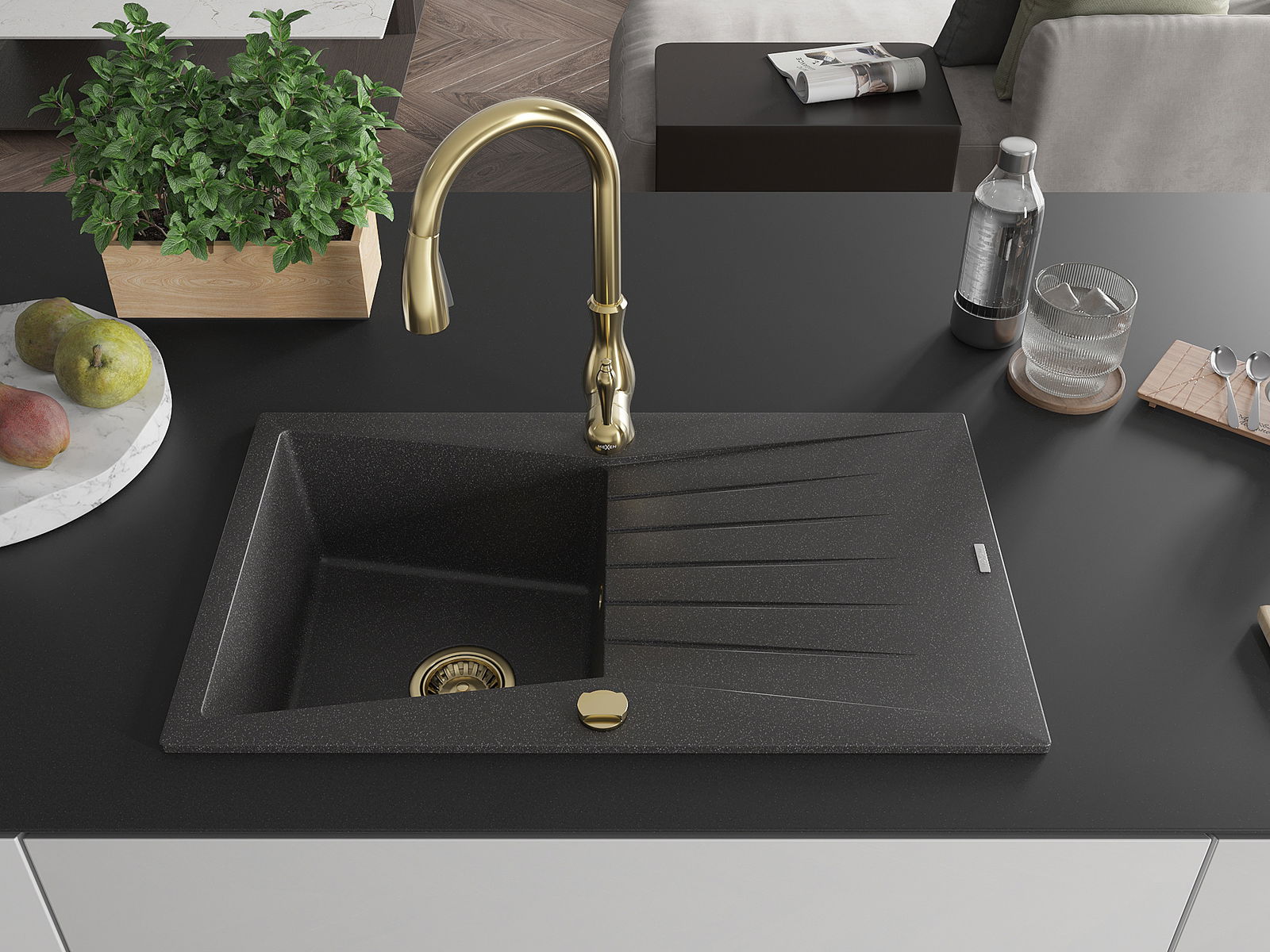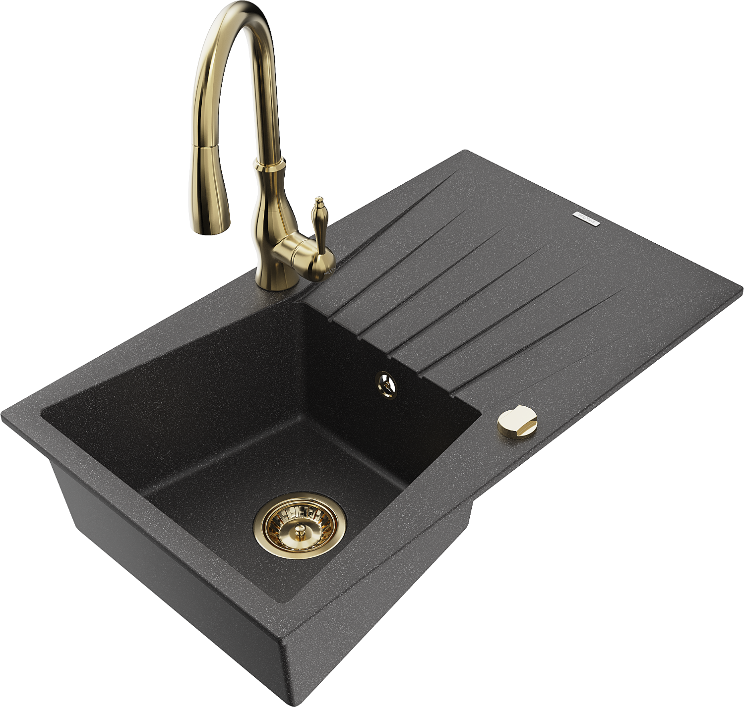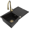 Mexen Cesar évier en granit 1 bac avec égouttoir et robinet de cuisine Savita, noir moucheté - 6514-76-672601-50