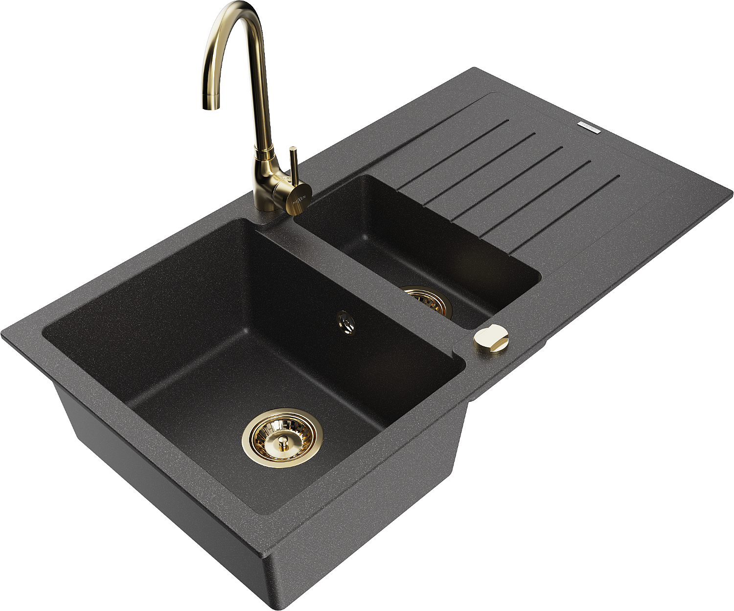 Mexen Matias évier en granit 1,5-bac avec égouttoir et robinet de cuisine Telma, noir moucheté - 6502-76-670200-50