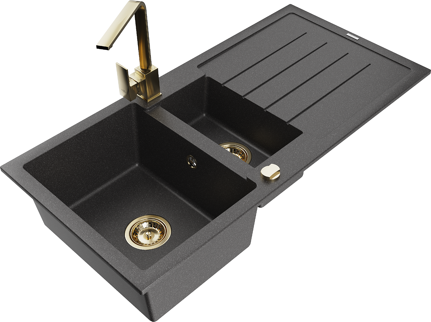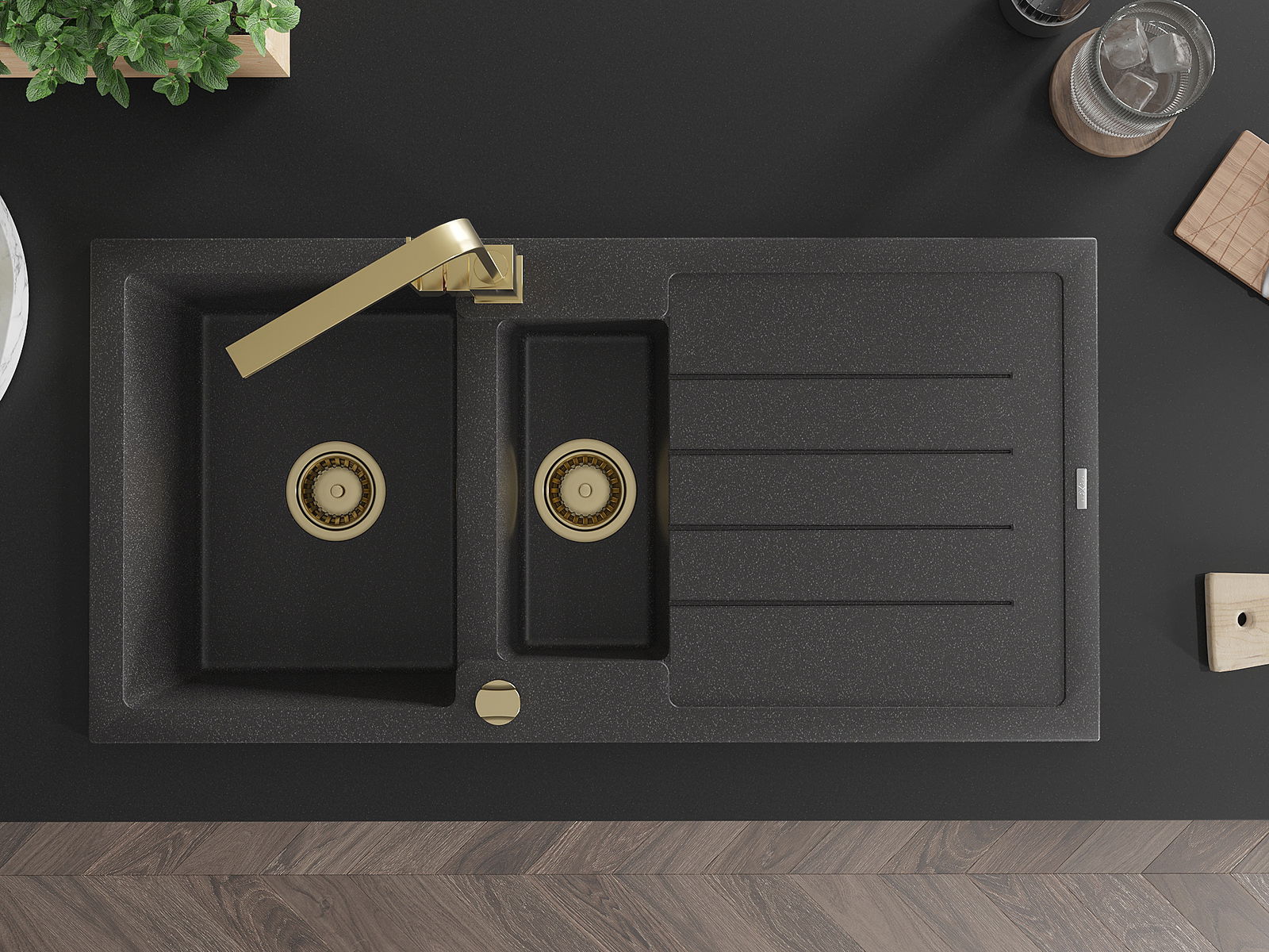 Mexen Andres évier en granit 1,5 bacs avec égouttoir et robinet de cuisine Rita, noir moucheté - 6515-76-670300-50