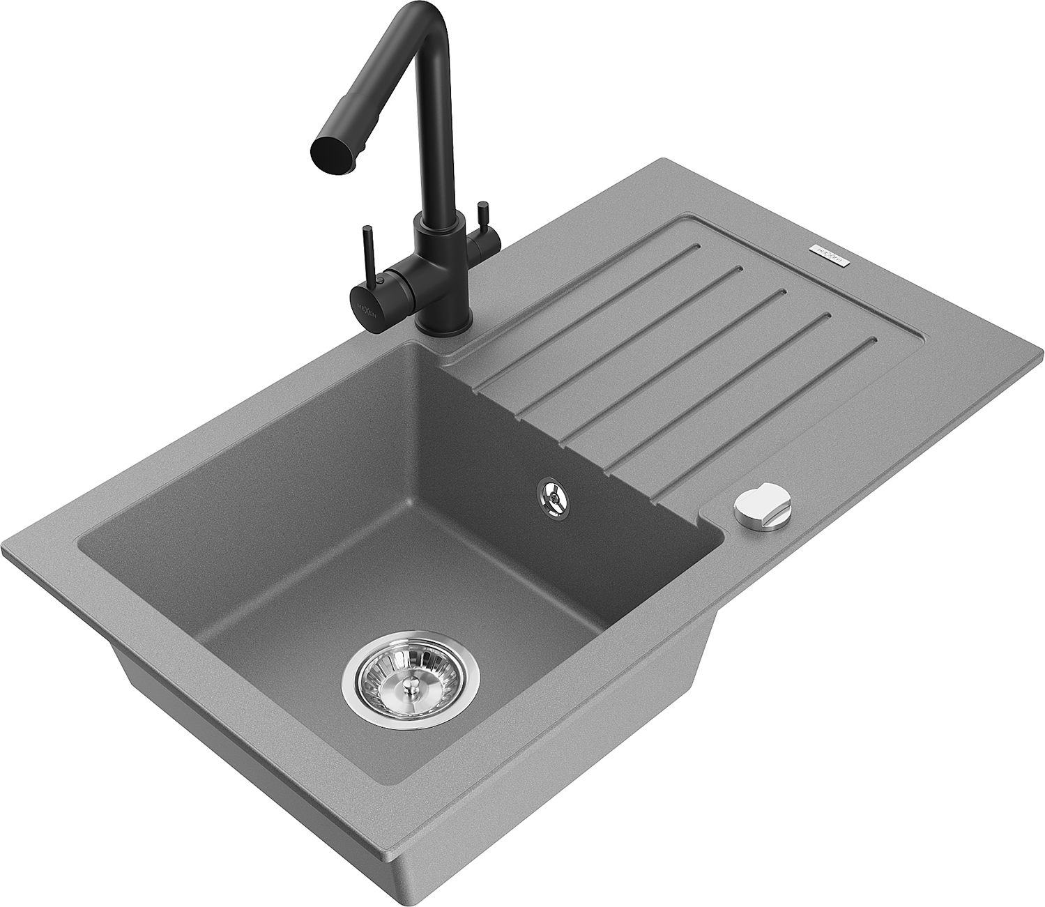Mexen Pablo évier en granit 1 bac avec égouttoir et robinet de cuisine Duero, gris - 6510-71-671600-70
