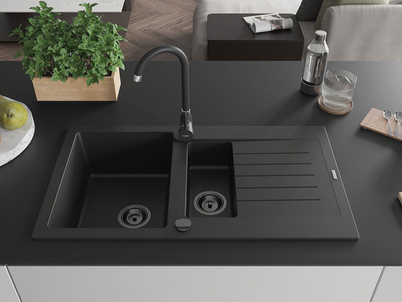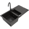 Mexen Matias évier en granit 1,5 bac avec égouttoir et robinet de cuisine Telma, noir - 6502-77-670200-70-B