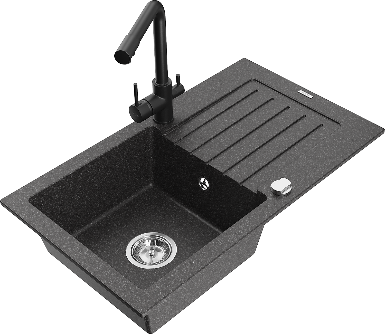 Mexen Pablo évier de cuisine en granit à 1 bac avec égouttoir et robinet de cuisine Duero, noir moucheté - 6510-76-671600-70