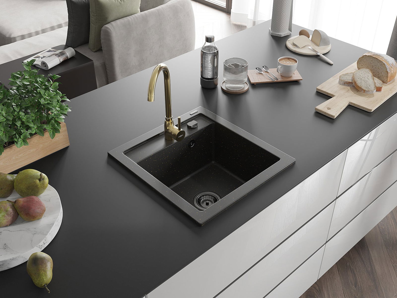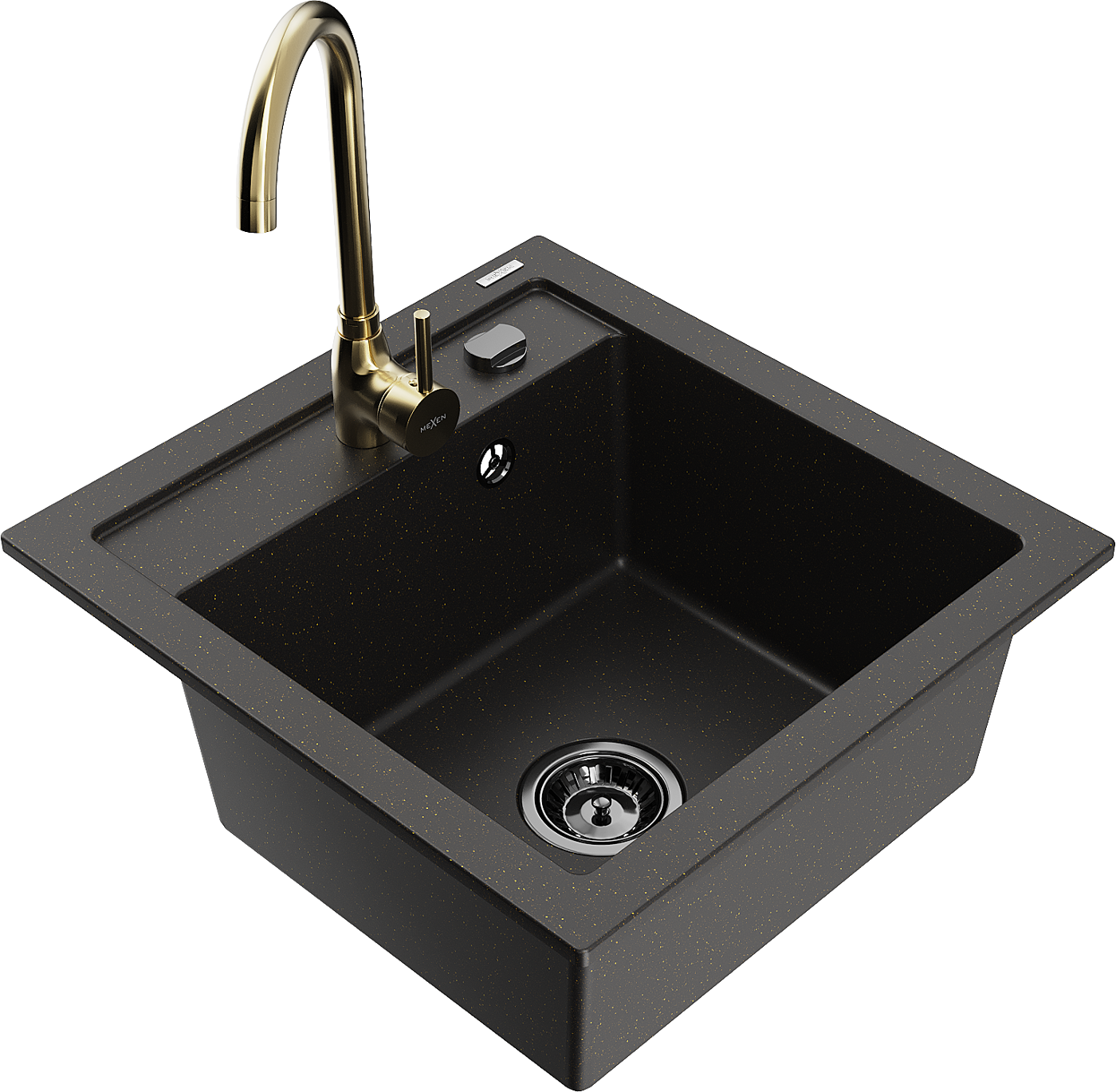 Mexen Vito évier en granit 1 bac avec mitigeur de cuisine Telma, noir/doré métallisé - 6503-75-670200-50-B