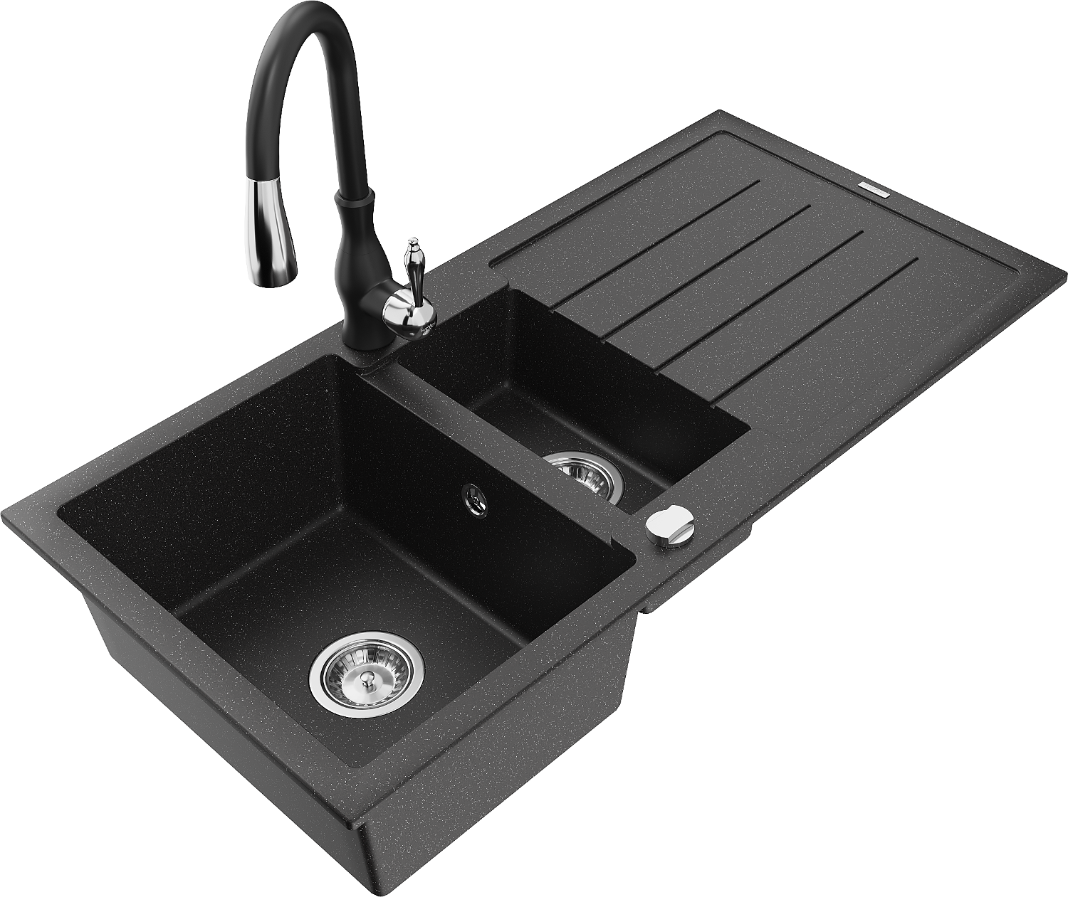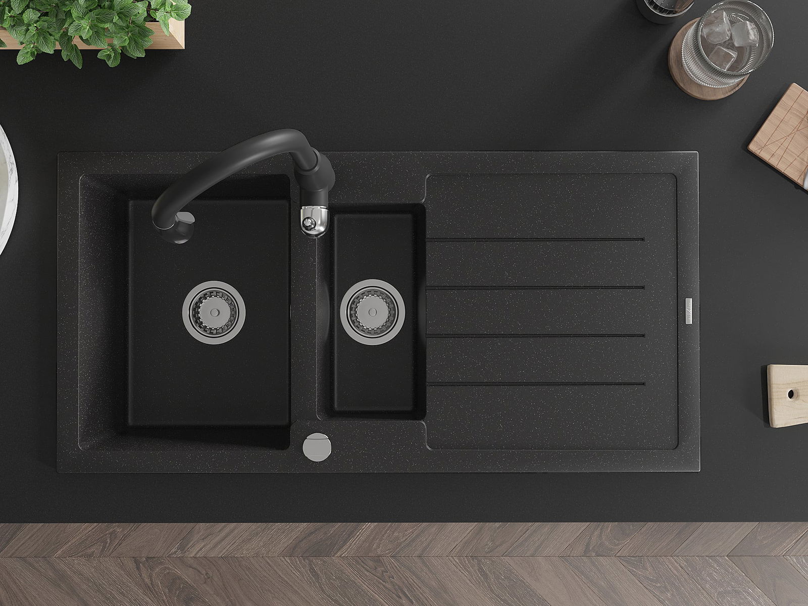 Mexen Andres évier en granit 1,5 bac avec égouttoir et robinet de cuisine Savita, noir/argent - 6515-73-672601-70