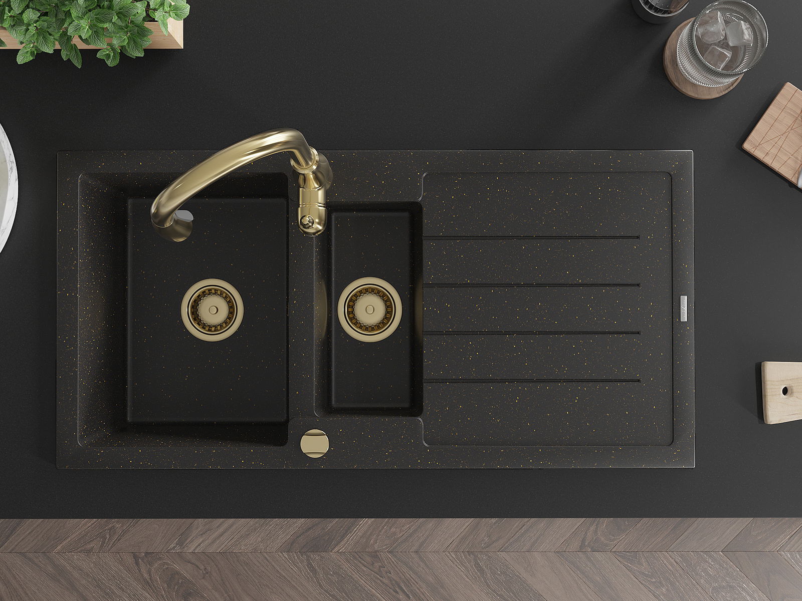 Mexen Andres évier en granit à 1,5 bac avec égouttoir et mitigeur de cuisine Savita, noir/doré métallisé