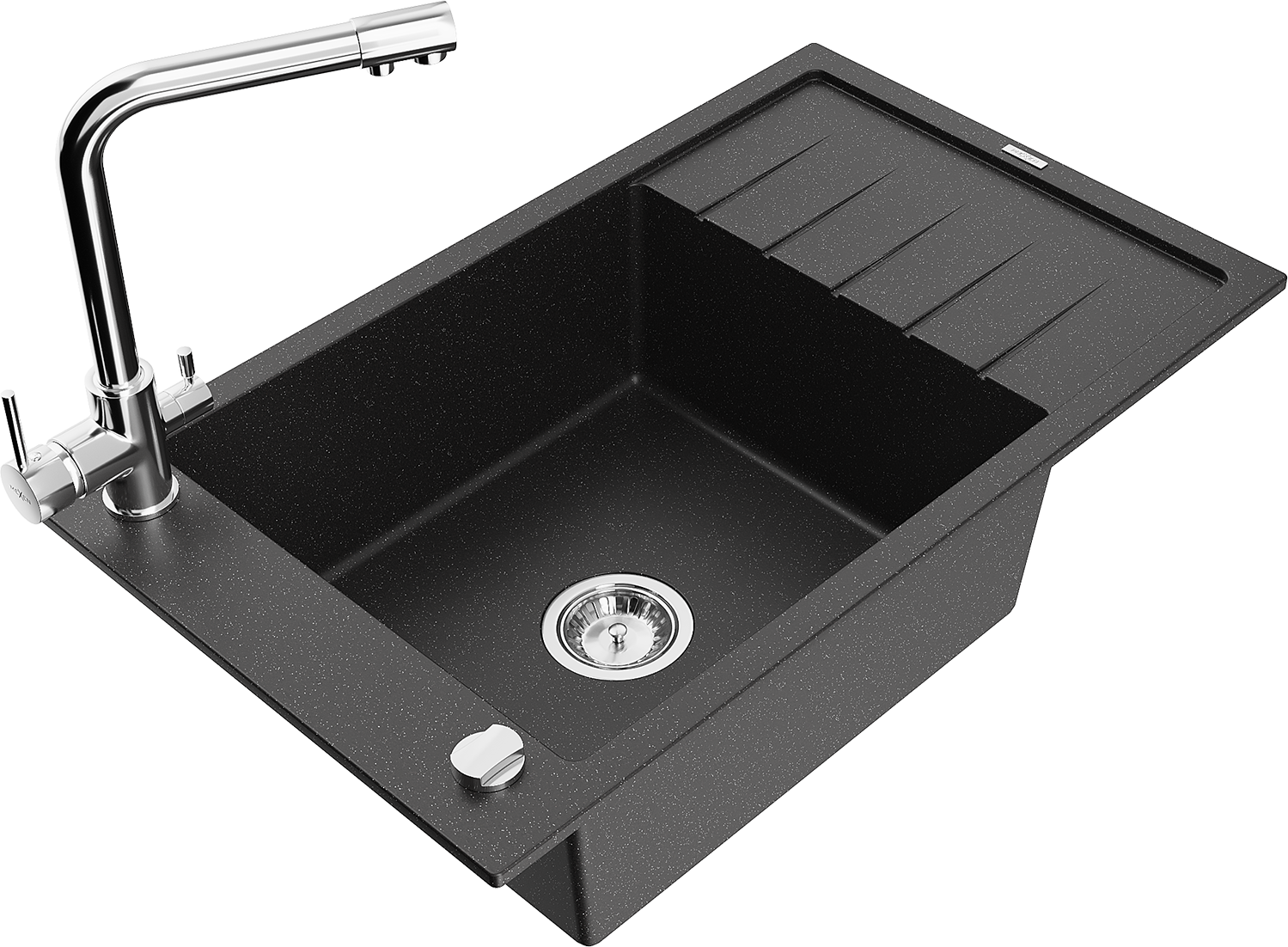 Mexen Elias évier en granit à 1 bac avec égouttoir et robinet de cuisine Duero, noir/argent métallisé - 6511-73-671600-00