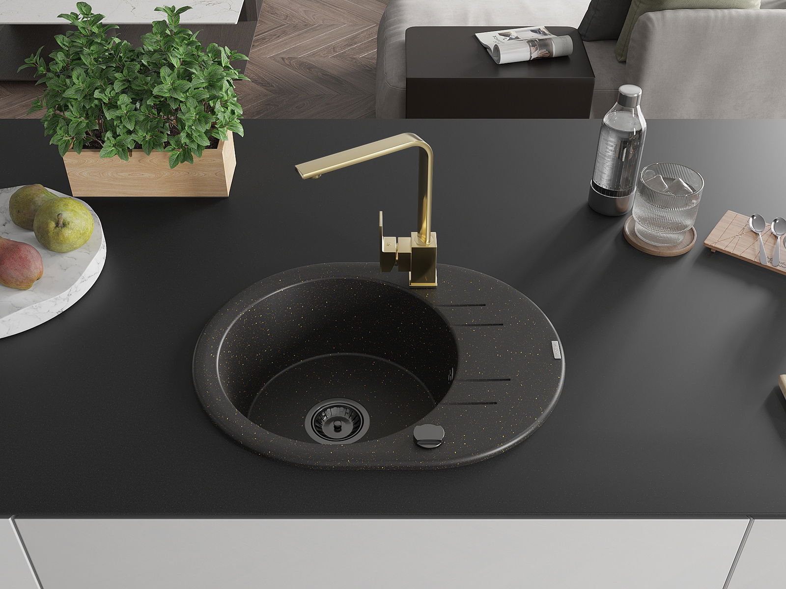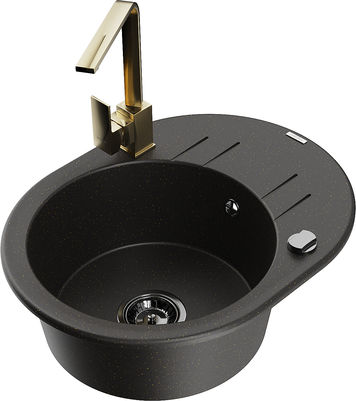 Mexen Kevin évier en granit 1 bac avec égouttoir et robinet de cuisine Rita, noir/or métallique - 6517-75-670300-50-B