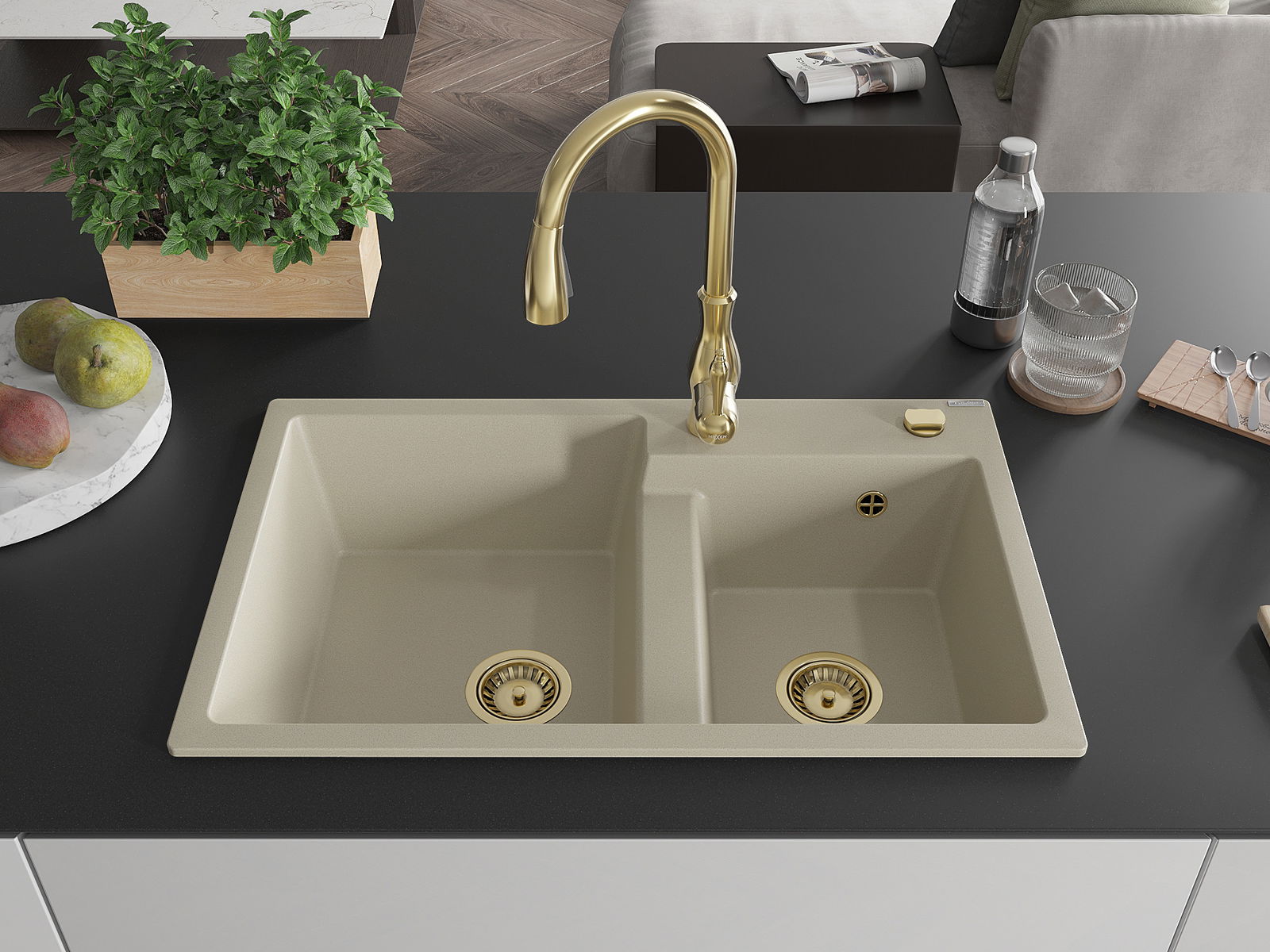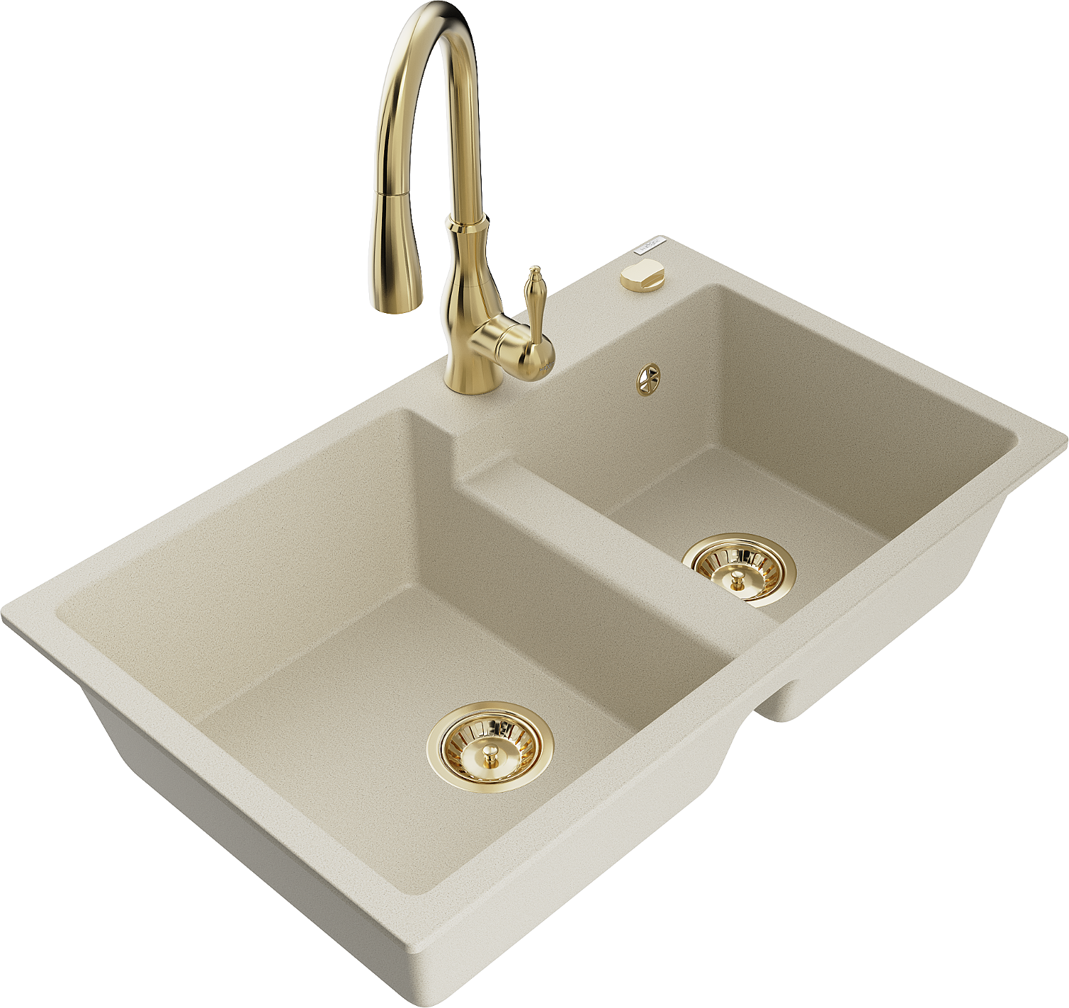 Mexen Tomas évier en granit 2 bacs avec robinet de cuisine Savita, beige - 6516-69-672601-50