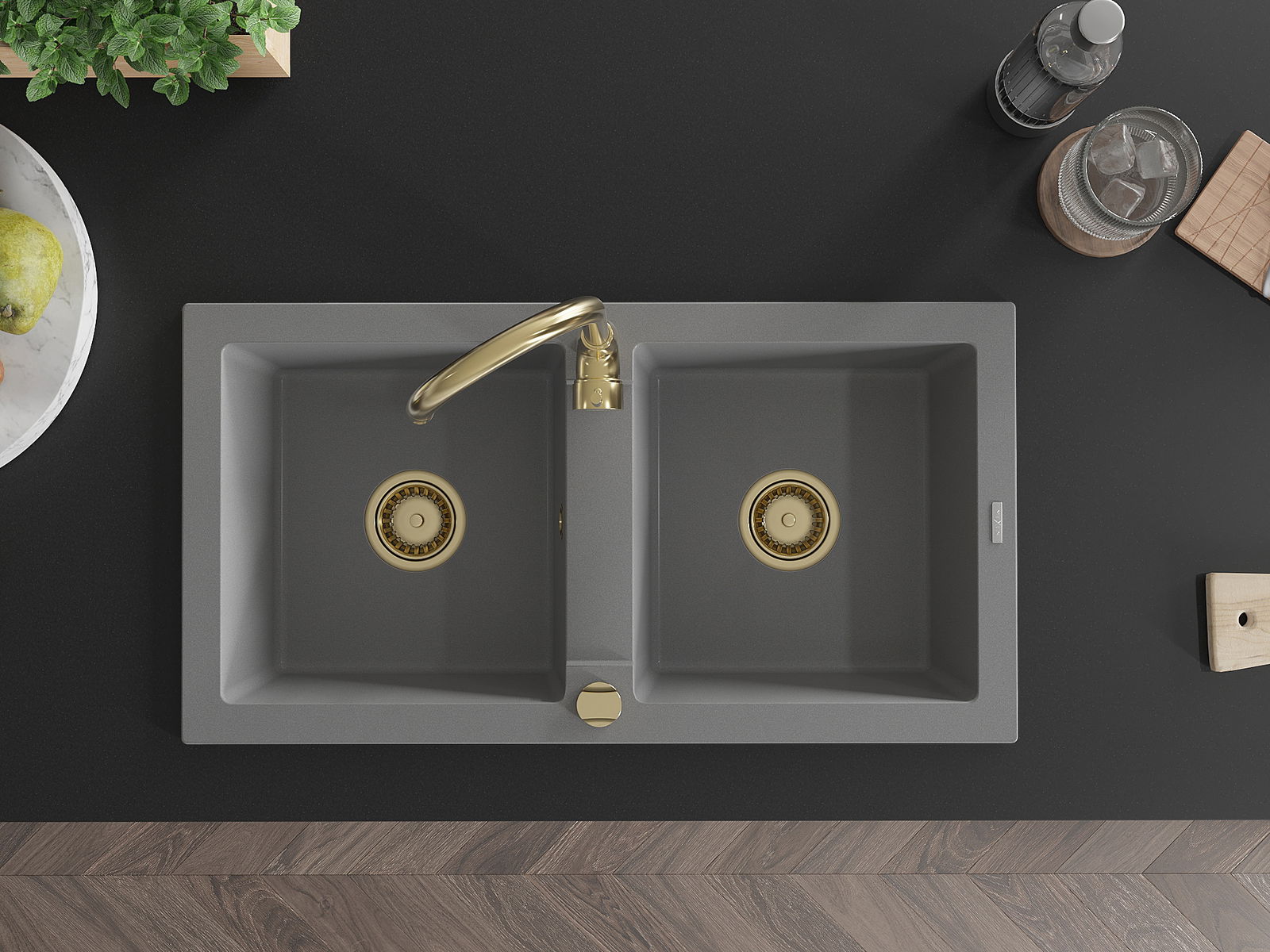 Mexen Mario évier en granit à 2 bacs avec robinet de cuisine Telma, gris - 6504-71-670200-50