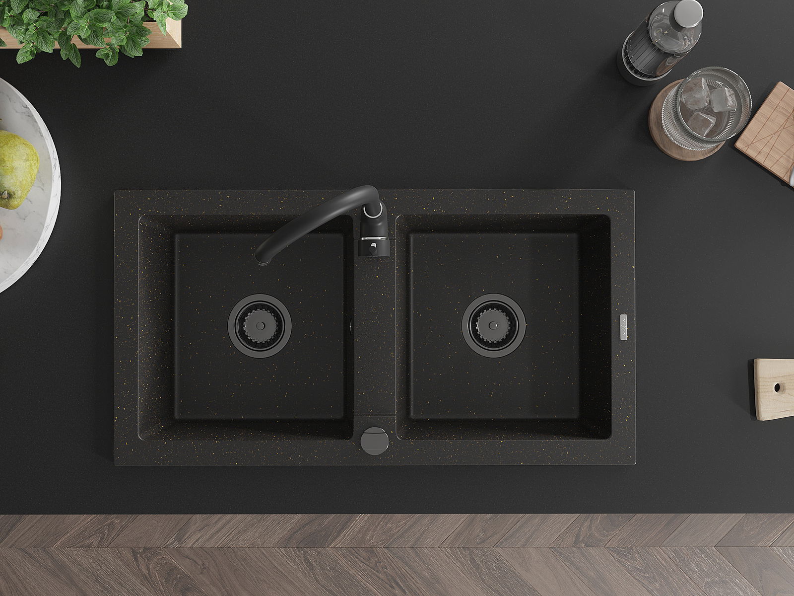 Mexen Mario évier en granit 2 bacs avec robinet de cuisine Telma, noir/or - 6504-75-670200-70-B