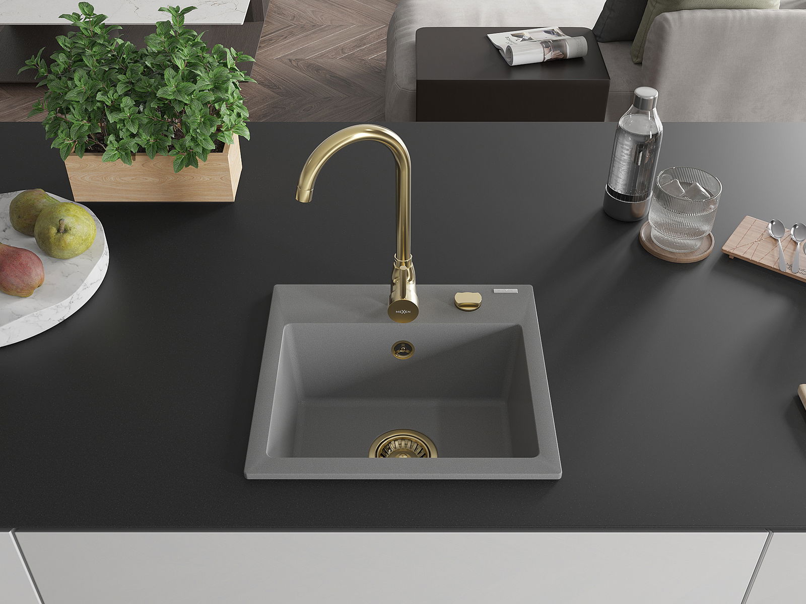 Mexen Milo évier en granit 1 bac avec mitigeur de cuisine Telma, gris - 6505-71-670200-50