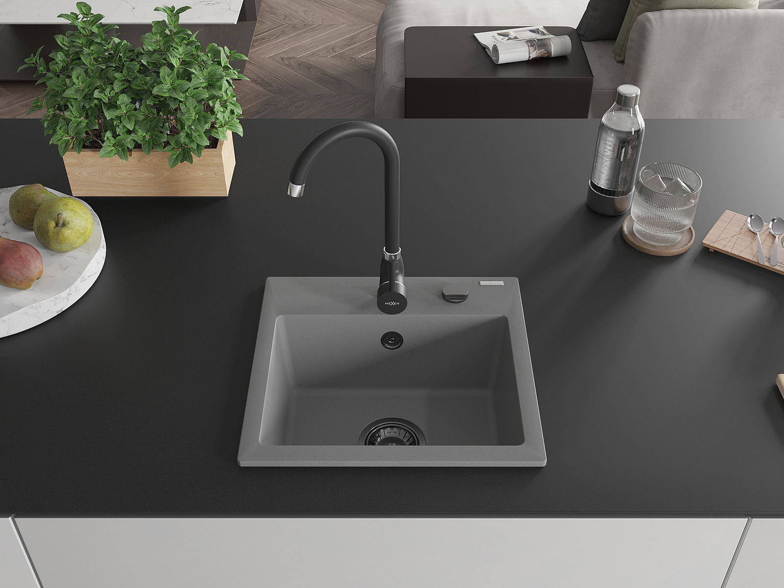 Mexen Milo évier en granit 1 bac avec robinet de cuisine Telma, gris - 6505-71-670200-70-B