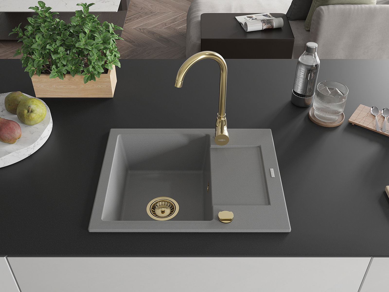 Mexen Enzo évier en granit à 1 bac avec égouttoir et robinet de cuisine Telma, gris - 6506-71-670200-50