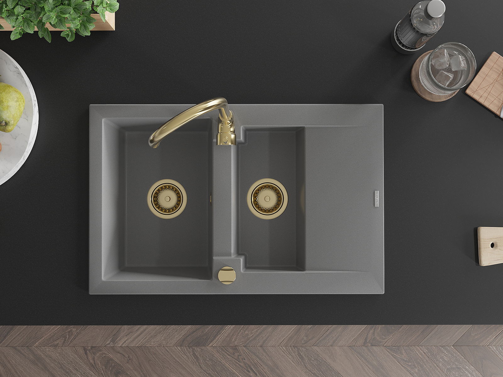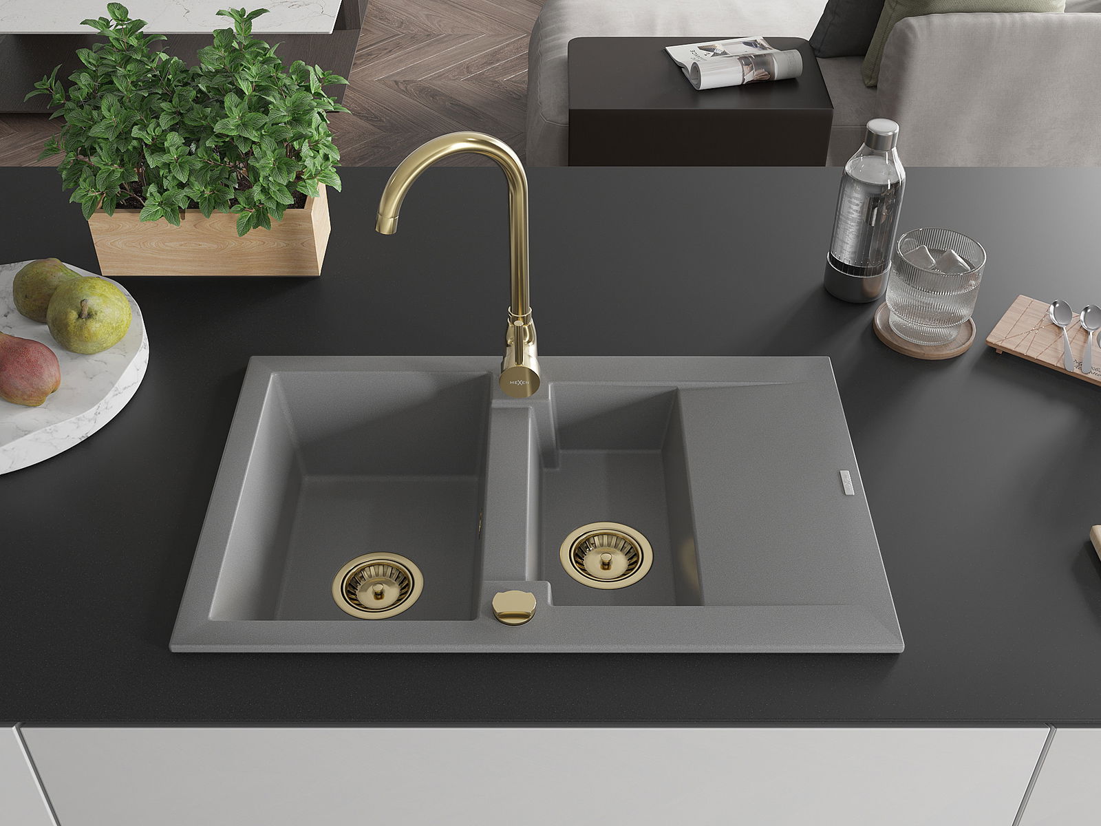 Mexen Gaspar évier en granit 1,5 bac avec égouttoir et robinet de cuisine Telma, gris - 6507-71-670200-50