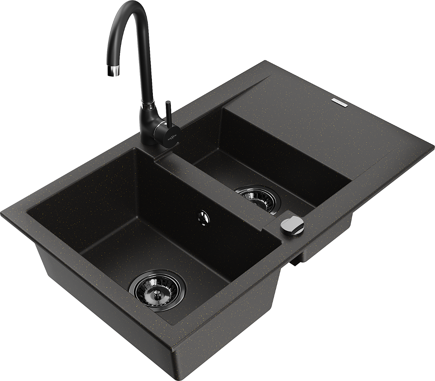 Mexen Gaspar évier en granit 1,5 bac avec égouttoir et robinet de cuisine Telma, noir/or - 6507-75-670200-70-B