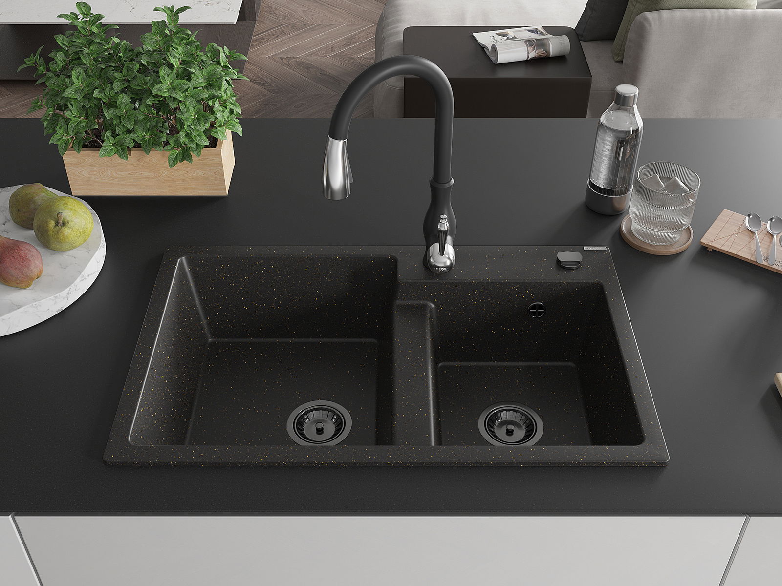 Mexen Tomas évier de cuisine en granit à 2 bacs avec robinet de cuisine Savita, noir/or métallisé - 6516-75-672601-70-B