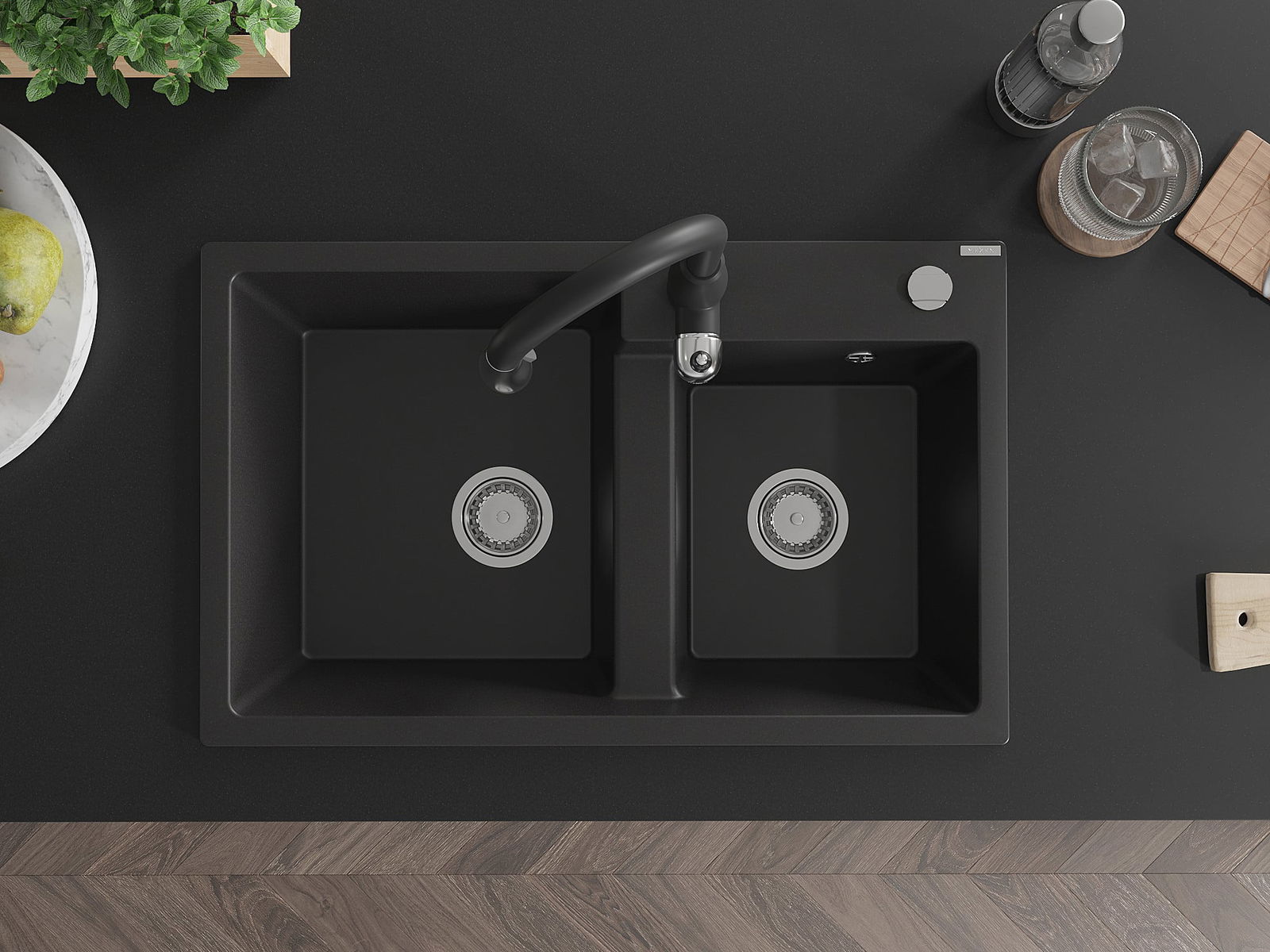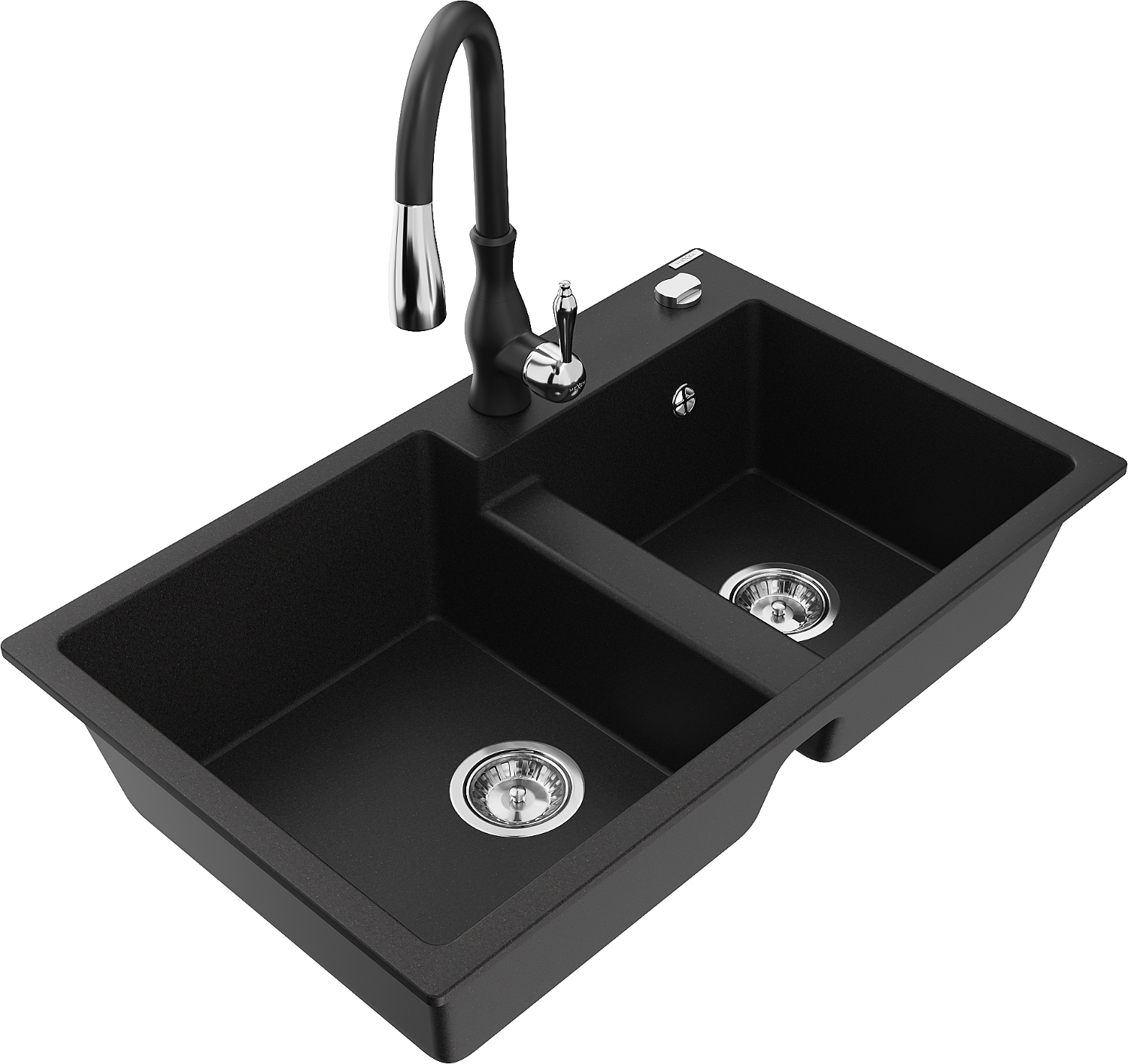 Mexen Tomas évier en granit à 2 bacs avec mitigeur de cuisine Savita, noir - 6516-77-672601-70